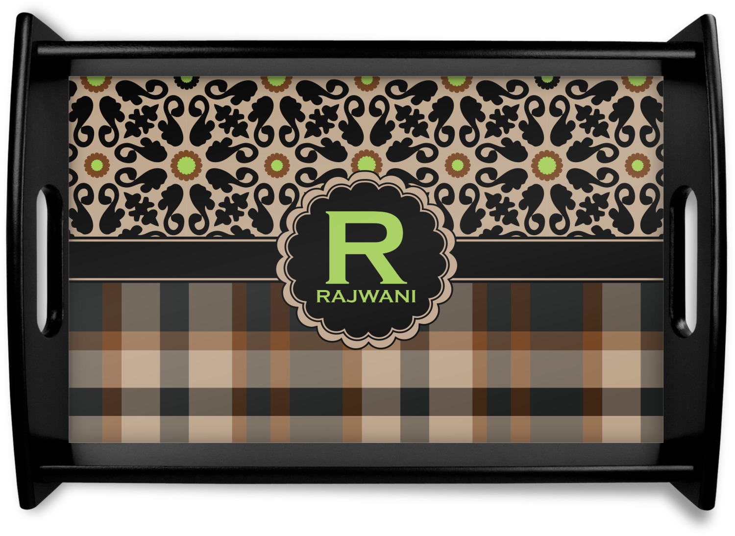 This serving tray with handles features square edges and two rounded sides, creating a very modern look. Each side is fabricated from a beautifully cut, natural wood. The bottom of the interior of the tray displays your customized design in bright, vibrant color. The tray is sold in both a black color and a natural wood look. Each variation of the wood serving tray has two sizes: Small, which is 14" x 10" x 2.25", and Large, which is 19.5" x 13.5" x 2.75".