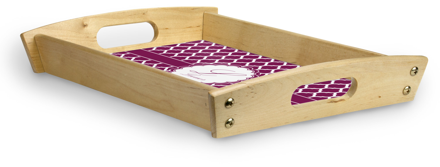 This serving tray with handles features square edges and two rounded sides, creating a very modern look. Each side is fabricated from a beautifully cut, natural wood. The bottom of the interior of the tray displays your customized design in bright, vibrant color. The tray is sold in both a black color and a natural wood look. Each variation of the wood serving tray has two sizes: Small, which is 14" x 10" x 2.25", and Large, which is 19.5" x 13.5" x 2.75".
