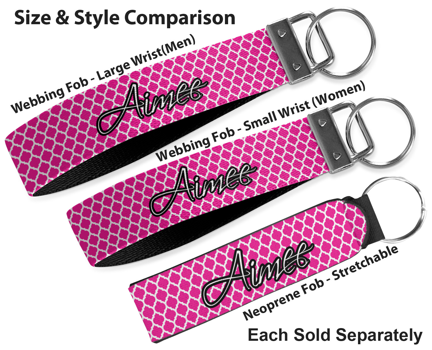 Made from neoprene, these key fob wristlets are comfortable, cushioned, easy to slip on and off; these traits allow it to maintain a slim, yet fashionable appearance, all while optimizing your efficiency. When attaching or removing keys, simply squeeze open the included metal ring. These fobs measure at around 4 inches, and have a bit of a stretch. Thus, they are best suited for small to medium size wrists. If you require a larger size, check out our webbing keychain fob for larger sizing.