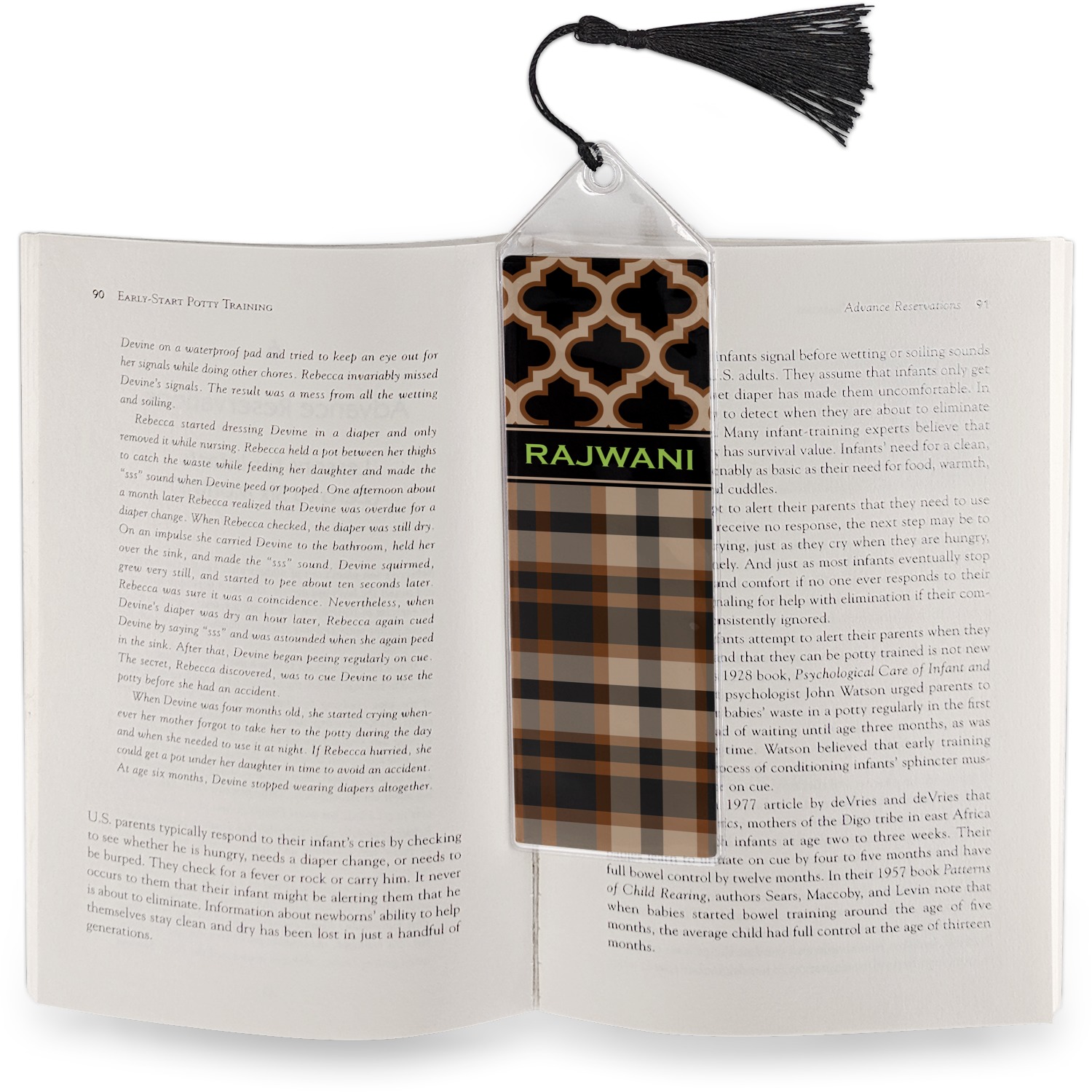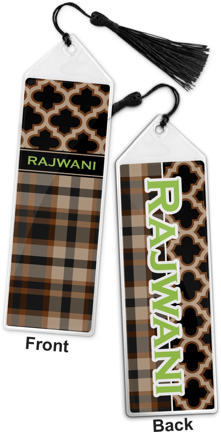 Your personalized bookmark is made of a sturdy, clear vinyl, and is approximately 7.5" x 2.25". We display your personalization on vinyl inserts that are placed on both sides. Accompanying each book marker is a black, fringe tassel that attaches to the reinforced, triangular header.