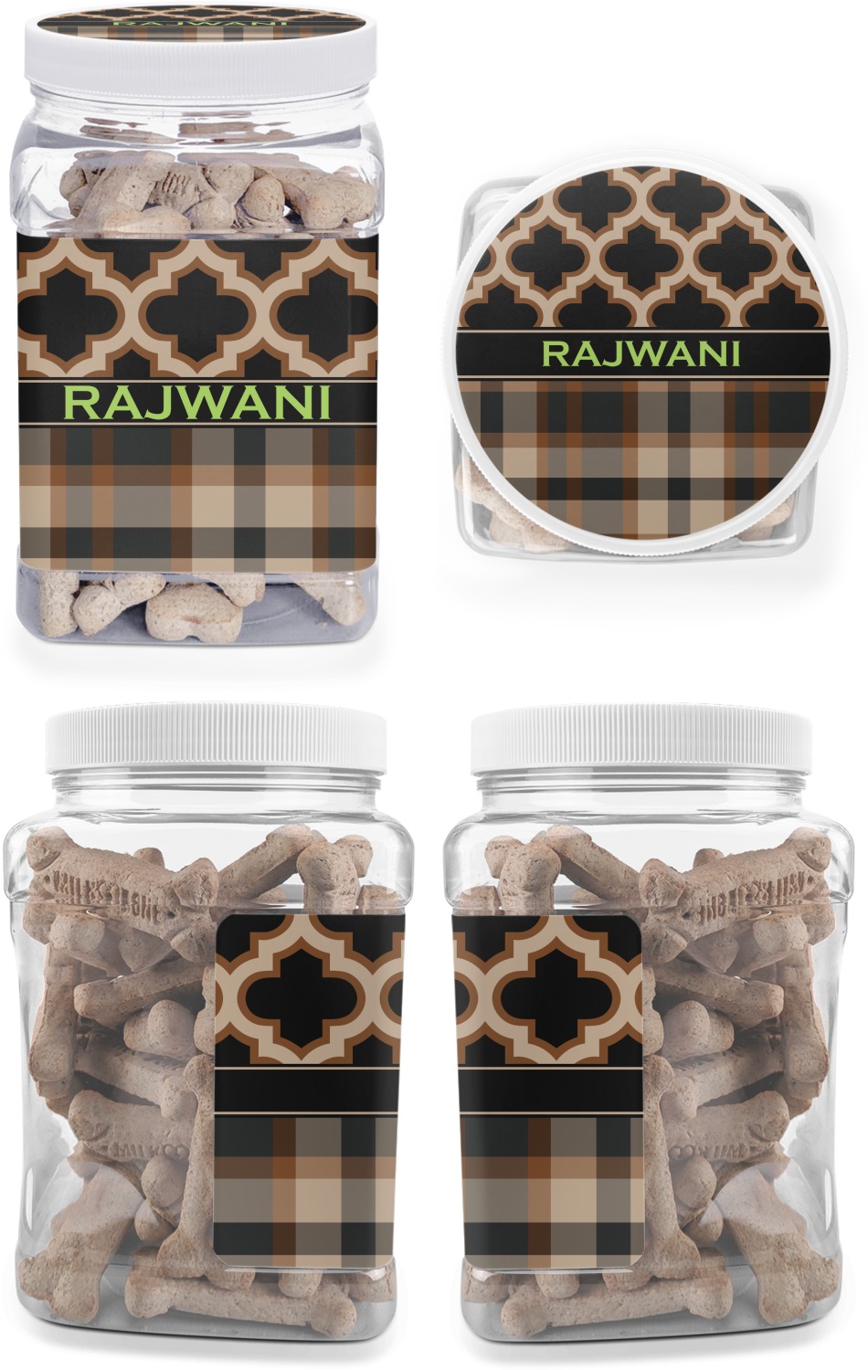 This half gallon jar, made from a sturdy plastic, is the perfect way to keep treats from any naughty pet paws, while still keeping them ready on hand for when your pup performs an impressive trick. This dog cookie jar features a screw-on, white lid that displays your personalized design on a vinyl sticker. We apply another customized sticker that wraps around the front and sides of the jar. Our dog treat jar also has indentations on the rear ends of the sides, which allows for convenient handling, and its square frame allows for easy storage.