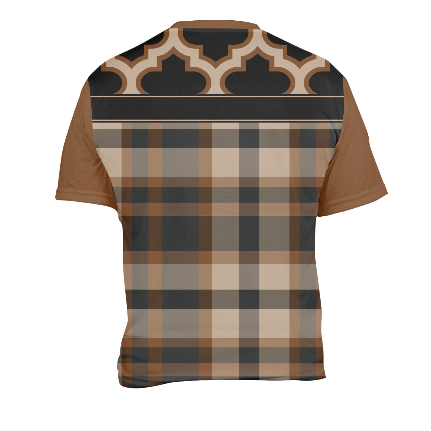 Old world and modern collide to produce this gorgeous design. The top of this design brings to life a tradition Moroccan pattern using the modern colors of brown, tan and black. The bottom half is a beautiful plaid design using the same colors from the Moroccan pattern.