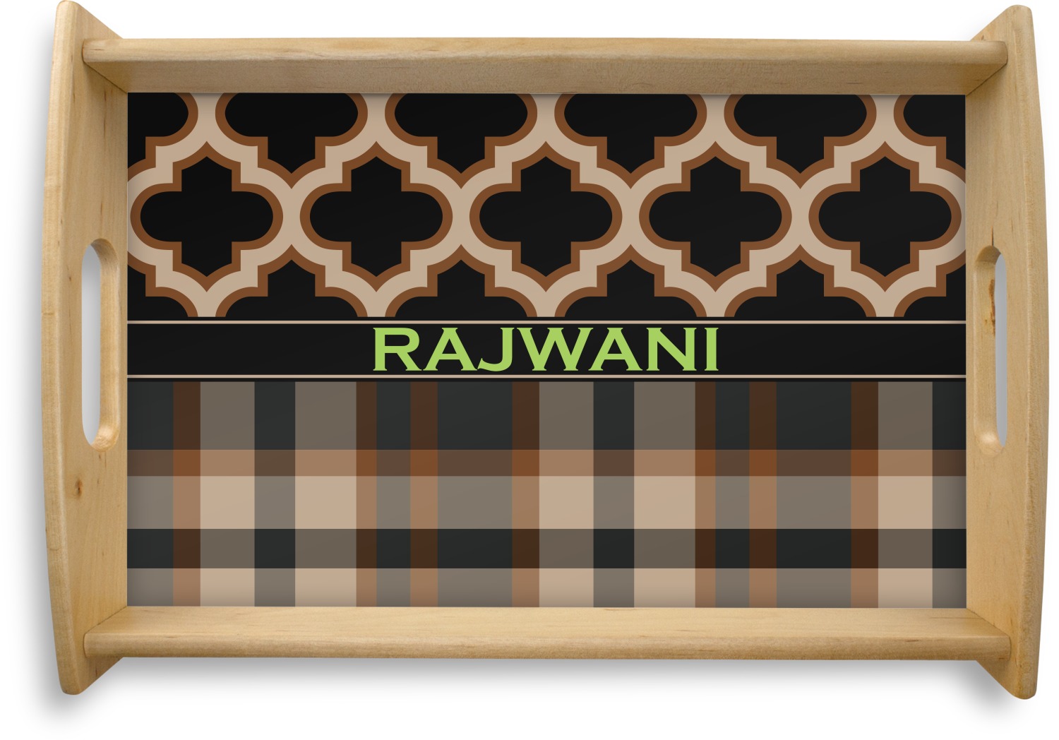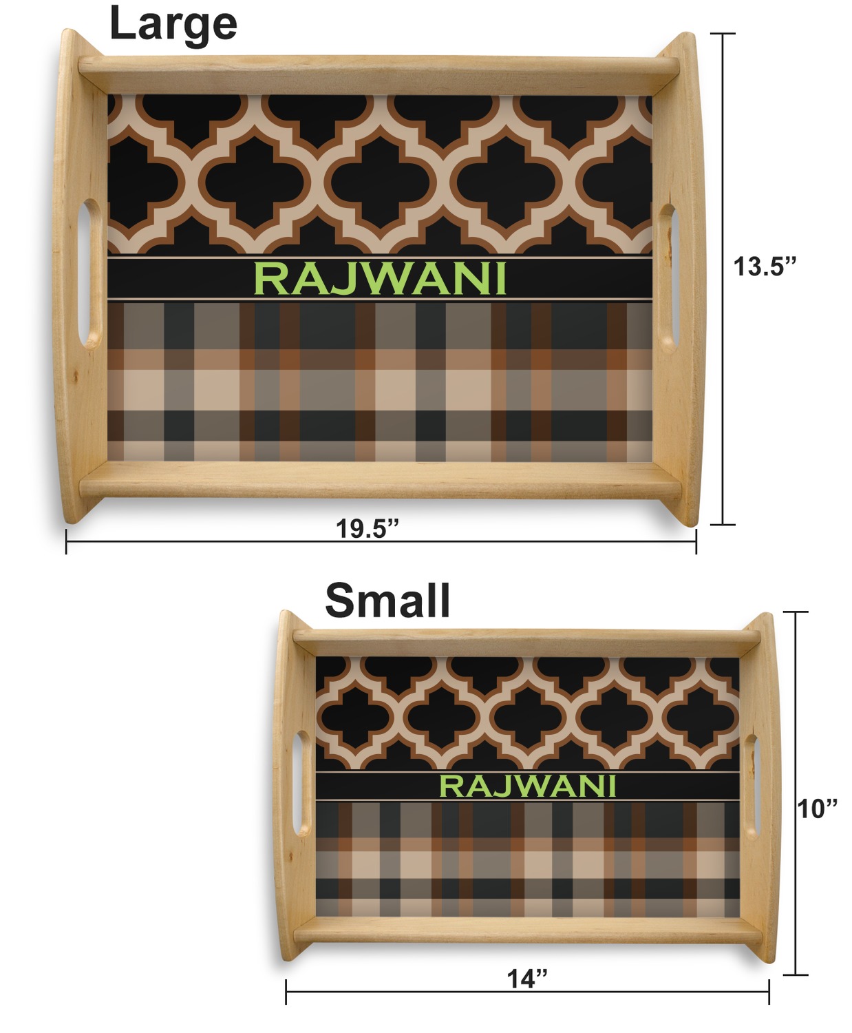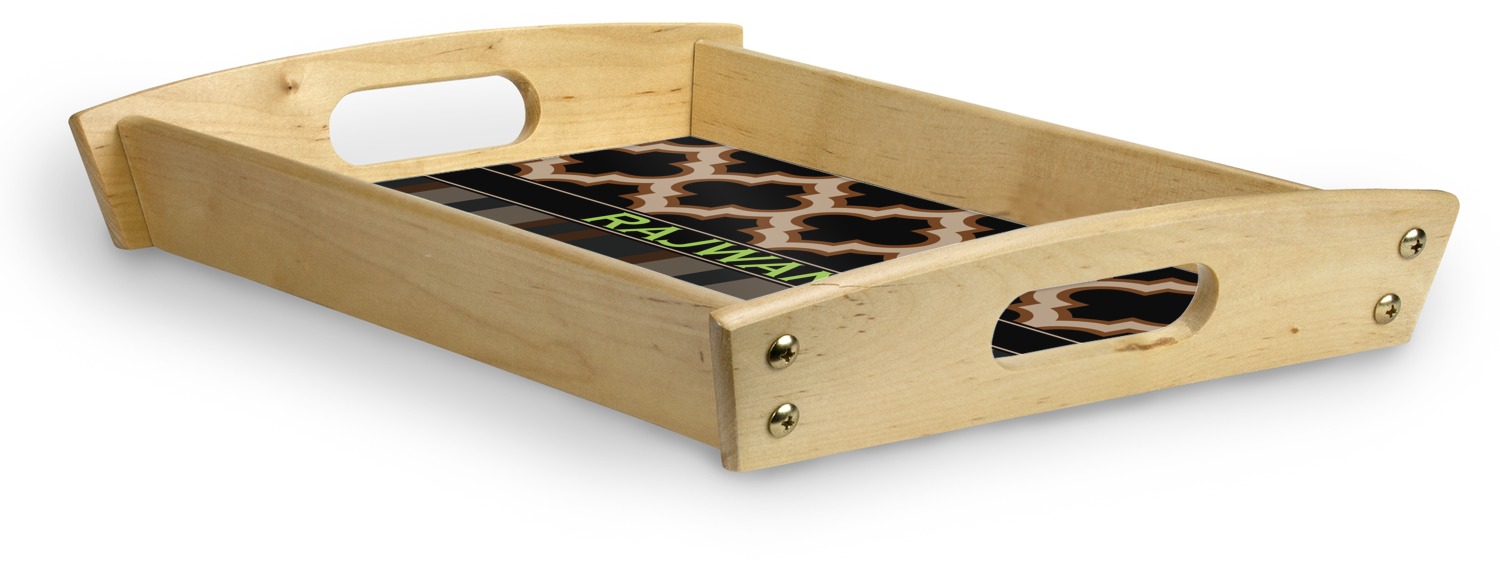 This serving tray with handles features square edges and two rounded sides, creating a very modern look. Each side is fabricated from a beautifully cut, natural wood. The bottom of the interior of the tray displays your customized design in bright, vibrant color. The tray is sold in both a black color and a natural wood look. Each variation of the wood serving tray has two sizes: Small, which is 14" x 10" x 2.25", and Large, which is 19.5" x 13.5" x 2.75".
