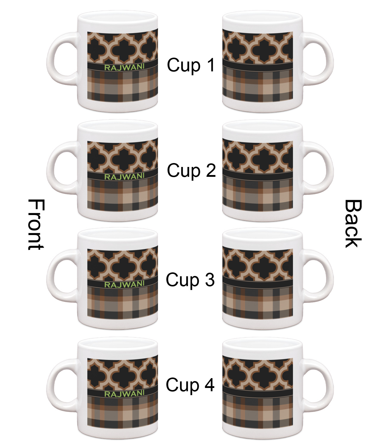 Each of our espresso mugs is a ceramic material sure to keep your drink warm. Personalize one cup for yourself, or order a set of 4! Its the perfect little gift for any coffee lover! We carry two sizes for you to personalize - 3 oz. (approx. 3.25" x 2.325" x 2.625") or 6 oz. (approx. 4" x 2.9" x 2.9"). Our 3 oz. mug is perfect for that single shot espresso while our 6 oz. mug can be your next favorite cappuccino cup holding two shots of espresso!