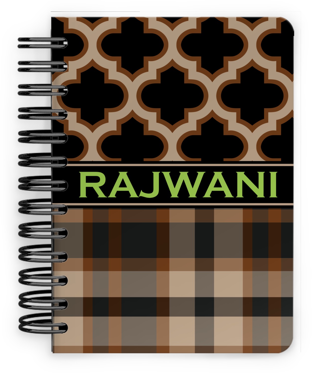 This spiral notebook includes 75 sheets of thick, ruled paper. The front and back of this custom notebook is made of a robust, laminate, plastic covering. We print your personalization on these two panels, underneath a glossy finish, which emphasizes the colors of your design. The two panels and the sheets of paper are held together by a sturdy, black coil. The paper within your bound notebook is perforated for easy, clean tearing.