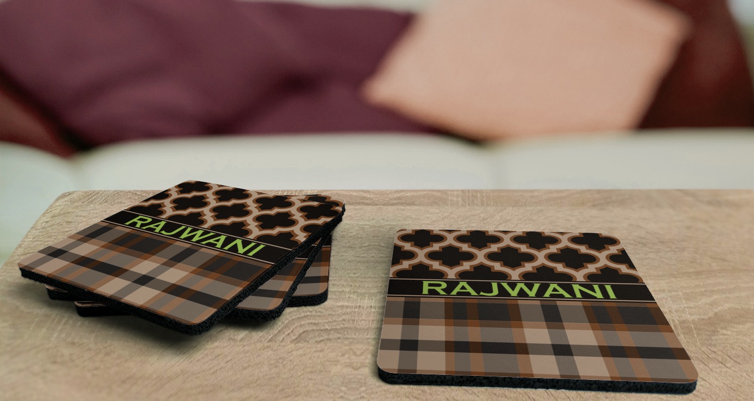 These drink coasters have a smooth, polyester top and a textured, rubber backing on its bottom. The non-slip rubber backing underneath works to keep any spills at bay. At 4 by 4 by 0.25 inches thick, these custom coasters are a suitable size for most drinkware. Your personalization is displayed atop the face of the cup coaster. We sell these rubber coasters in two different shapes: square and round. You can buy each shape as singulars or as a set of 4.