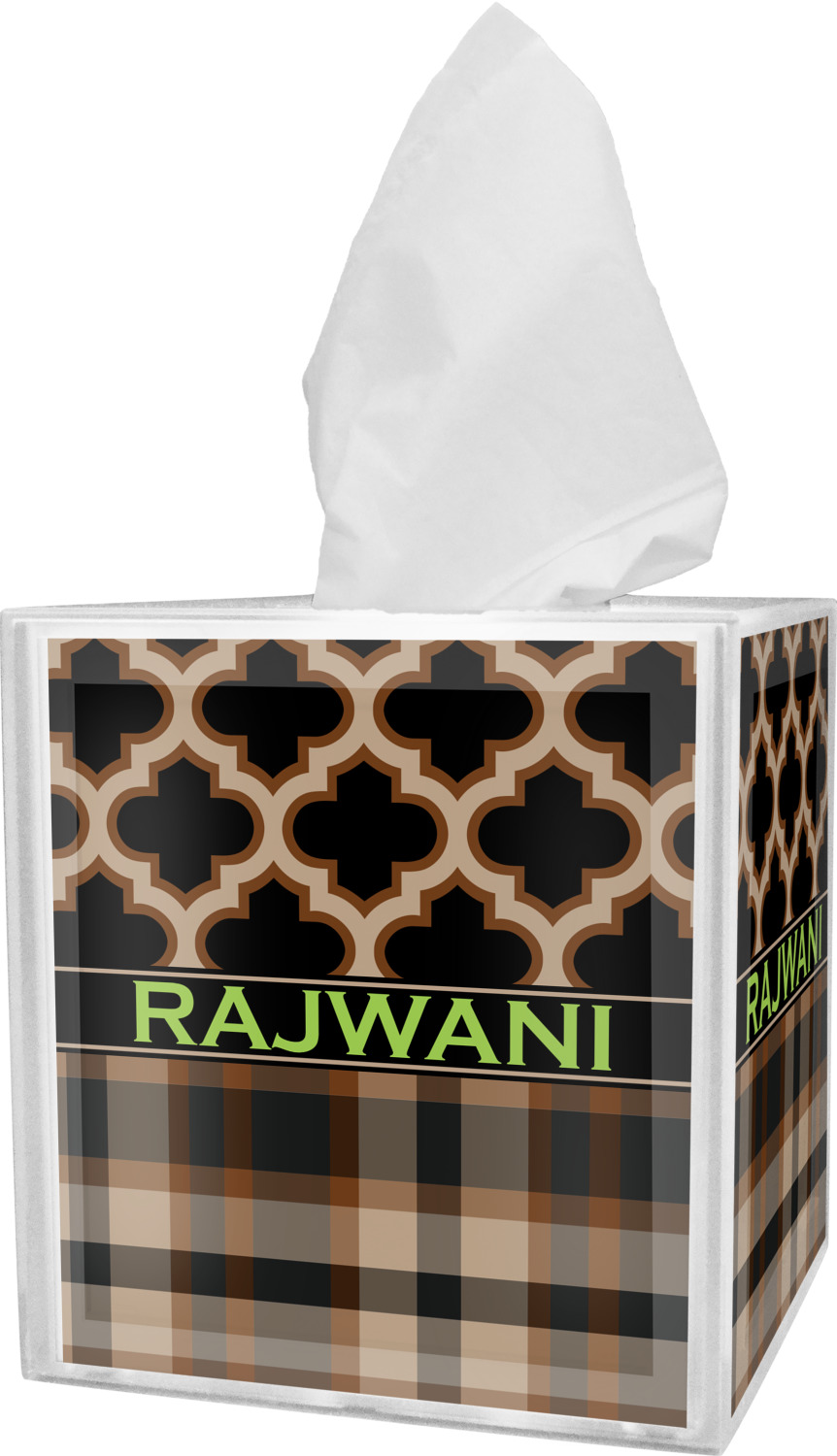 These tissue holders are built from durable acrylic and display your unique personalization on fine-quality vinyl inserts placed within the four sides and top. The box features two pieces, allowing you to easily switch out tissue boxes. On the sides, youll find ridges that ensure the top and base fit securely in place. The bottom of these tissue box holders has four, rubber, non-slip pads to prevent the box from scuffing any surface you decide to display it on. Each box can fit a standard 5 by 5-inch box of tissues.