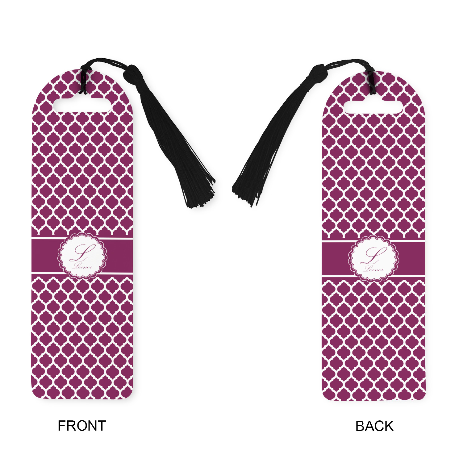 Made from a durable, flexible plastic, these bookmarks are printed with your custom design on them. With the tassel on them they make it easy to find your page in your book. These are a rectangular shape 7 1/4 inches tall with a rounded top and are approximately 2 1/4 inches wide.