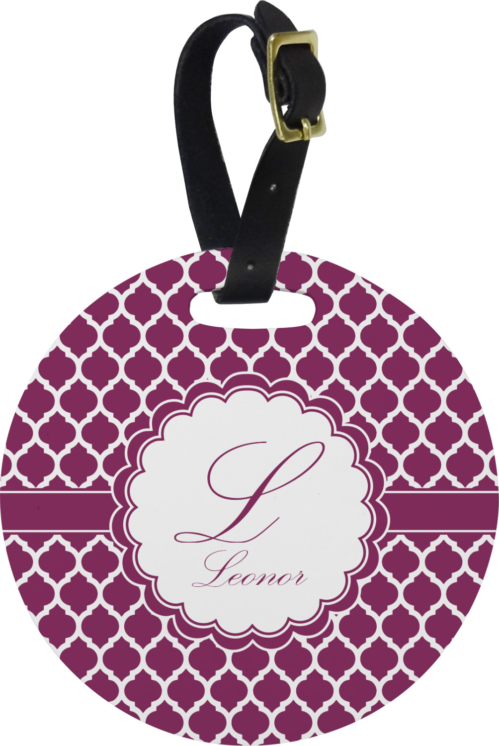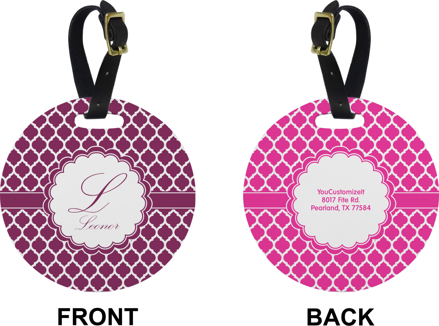 These personalized bag tags are sold in a variety of shapes, so that you may find the product that meets your vision exactly. We sell a round luggage tag, which measures at approximately 4" x 4". Our square luggage tag is about 3.5" x 3.5", while our rectangular version is 2.75" x 4 ".