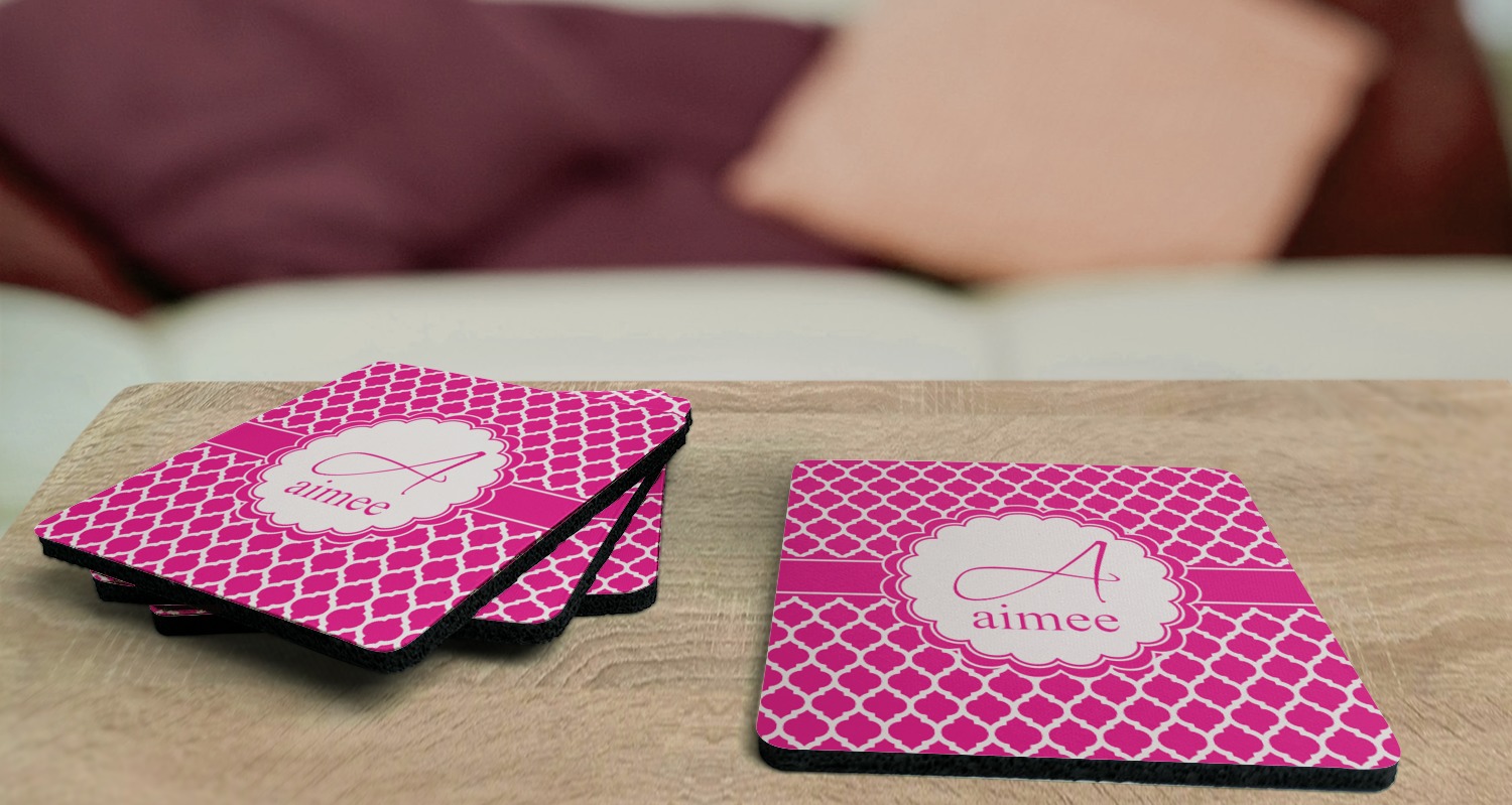 These drink coasters have a smooth, polyester top and a textured, rubber backing on its bottom. The non-slip rubber backing underneath works to keep any spills at bay. At 4 by 4 by 0.25 inches thick, these custom coasters are a suitable size for most drinkware. Your personalization is displayed atop the face of the cup coaster. We sell these rubber coasters in two different shapes: square and round. You can buy each shape as singulars or as a set of 4.