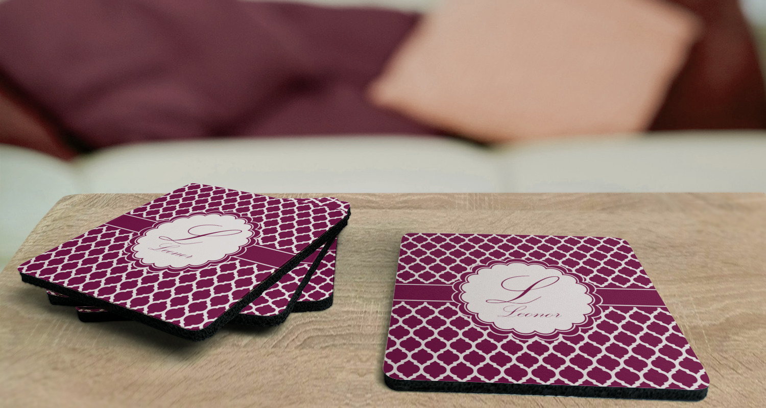 These drink coasters have a smooth, polyester top and a textured, rubber backing on its bottom. The non-slip rubber backing underneath works to keep any spills at bay. At 4 by 4 by 0.25 inches thick, these custom coasters are a suitable size for most drinkware. Your personalization is displayed atop the face of the cup coaster. We sell these rubber coasters in two different shapes: square and round. You can buy each shape as singulars or as a set of 4.