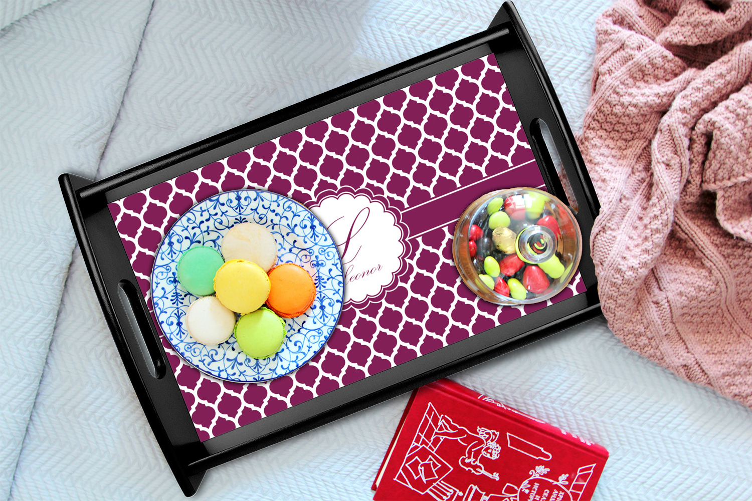 This serving tray with handles features square edges and two rounded sides, creating a very modern look. Each side is fabricated from a beautifully cut, natural wood. The bottom of the interior of the tray displays your customized design in bright, vibrant color. The tray is sold in both a black color and a natural wood look. Each variation of the wood serving tray has two sizes: Small, which is 14" x 10" x 2.25", and Large, which is 19.5" x 13.5" x 2.75".