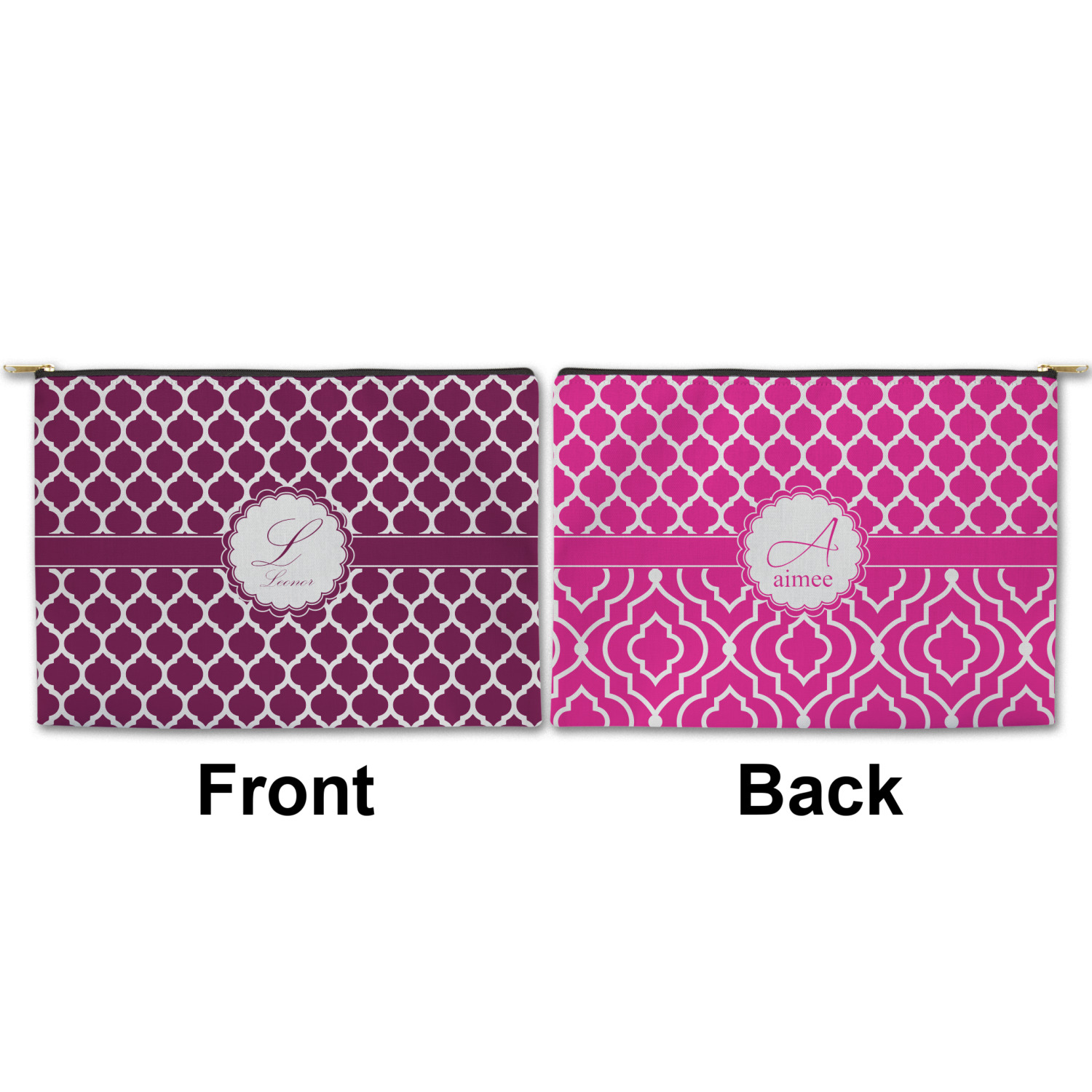 You can design both the front and the back of the pouch - same design, two complementary designs or two totally different designs - the choice is yours! We offer many different personalization styles i.e. name, name & initial, monograms - so the choice to personalize is also yours.