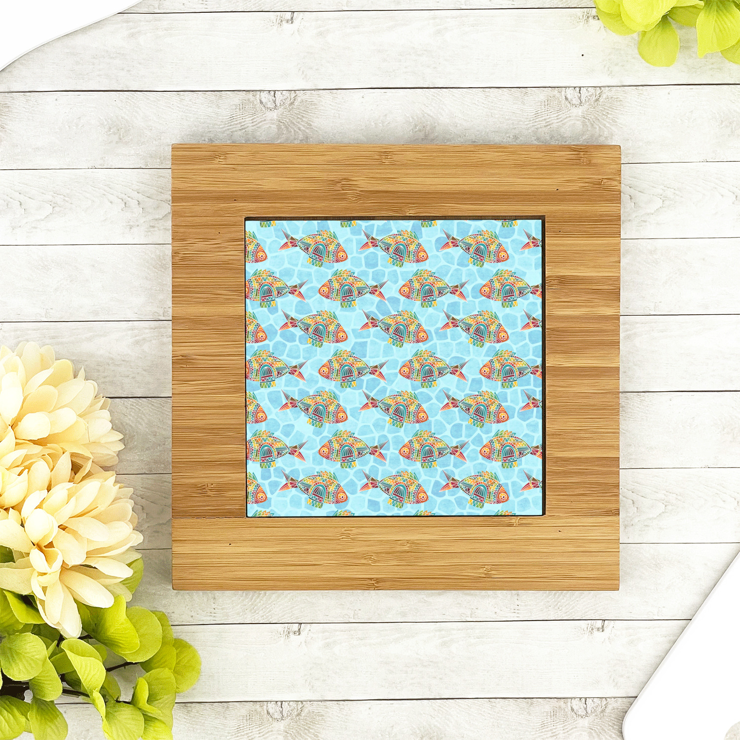 Looking for a fun, but still mature look for your beach house? This pattern with colorful mosaic fish with in a swimming pool tiles in the background is a great pattern to decorate with in a beach house or pool house or even just for pool bathroom . This pattern is also available with waves and a solid color background