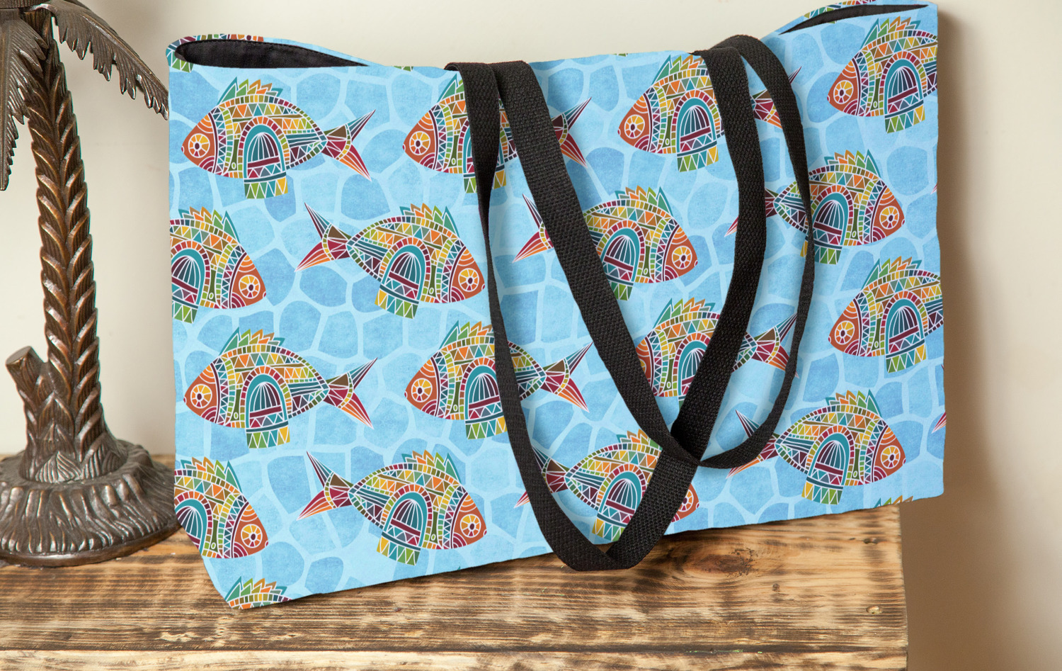 These beach totes are handmade here in the USA. Fabric is printed with your design. The tote is then sewn from the fabric pieces, lining and handles added.