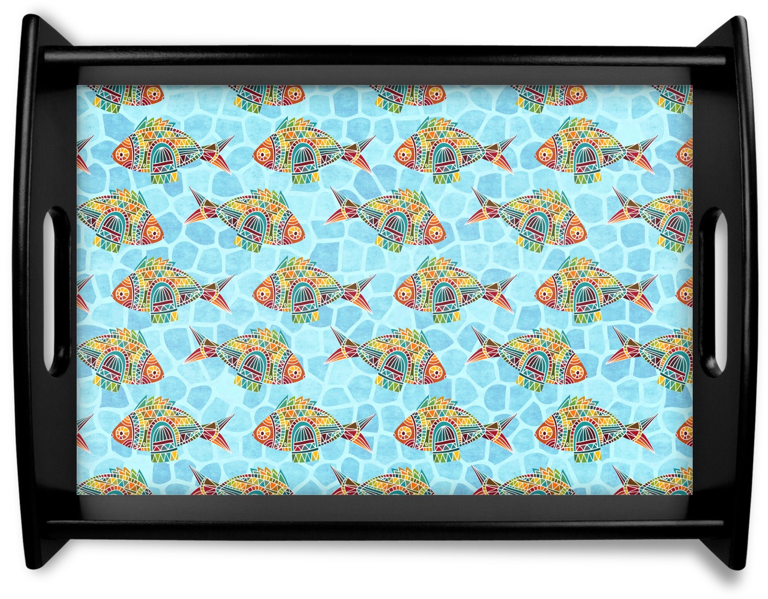 Looking for a fun, but still mature look for your beach house? This pattern with colorful mosaic fish with in a swimming pool tiles in the background is a great pattern to decorate with in a beach house or pool house or even just for pool bathroom . This pattern is also available with waves and a solid color background