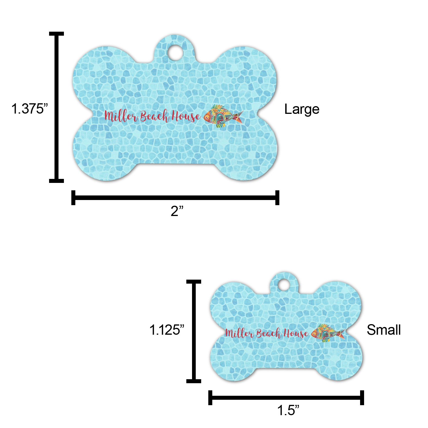 The small bone dog tag size is perfect to pair with our small dog collars, the large size pairs well with our large dog collars.