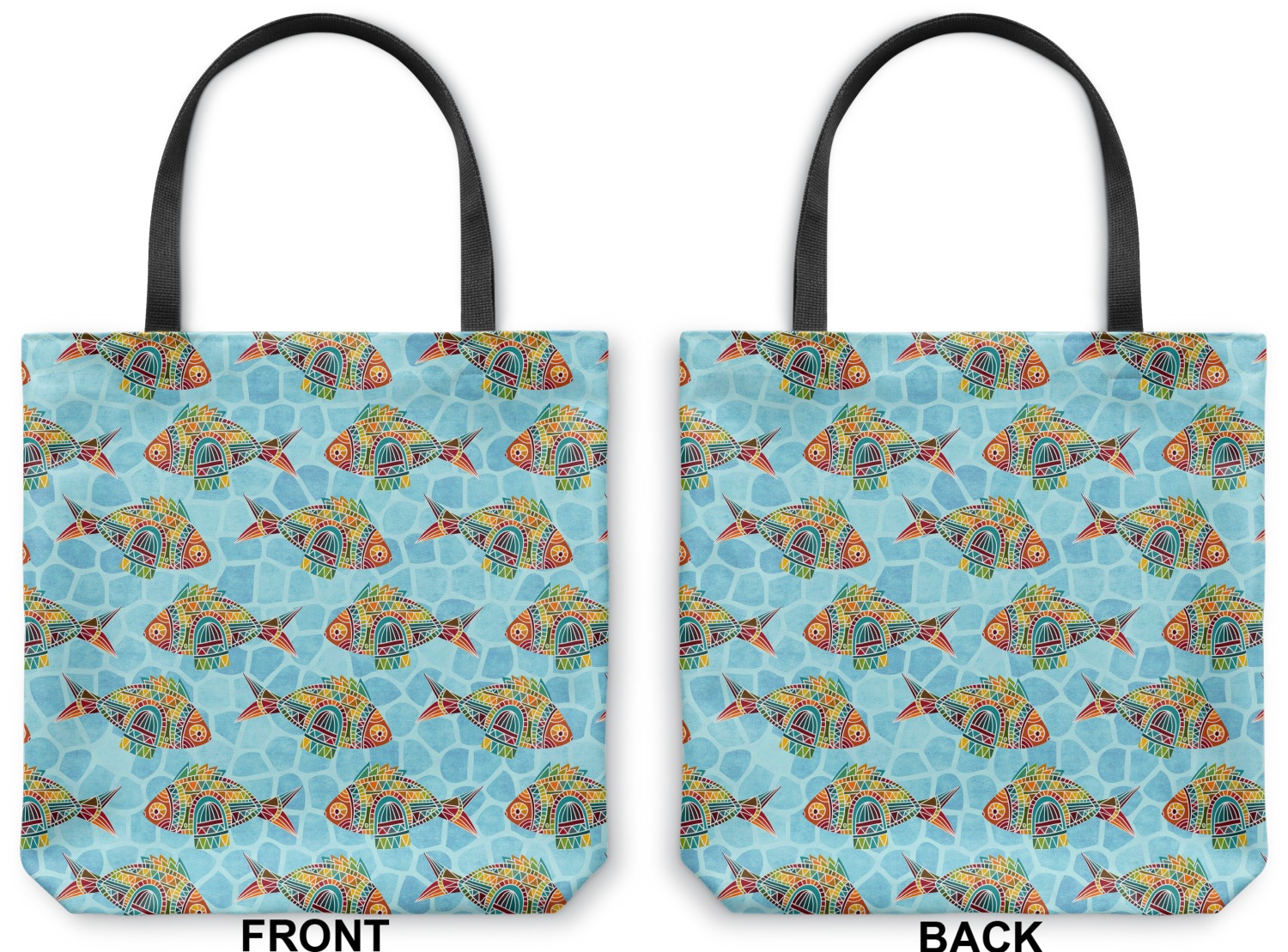 Our totes are made right here in the USA. Your design is printed on canvas fabric; the fabric is then cut and sewn on the sides and on the bottom to add an approximately 3.5 inch gusset. Black cotton handles are sewn in and reinforced. Your tote has a designs on both sides - the designs can be the same or different - the choice is yours. The inside of the tote has a black fused lining.