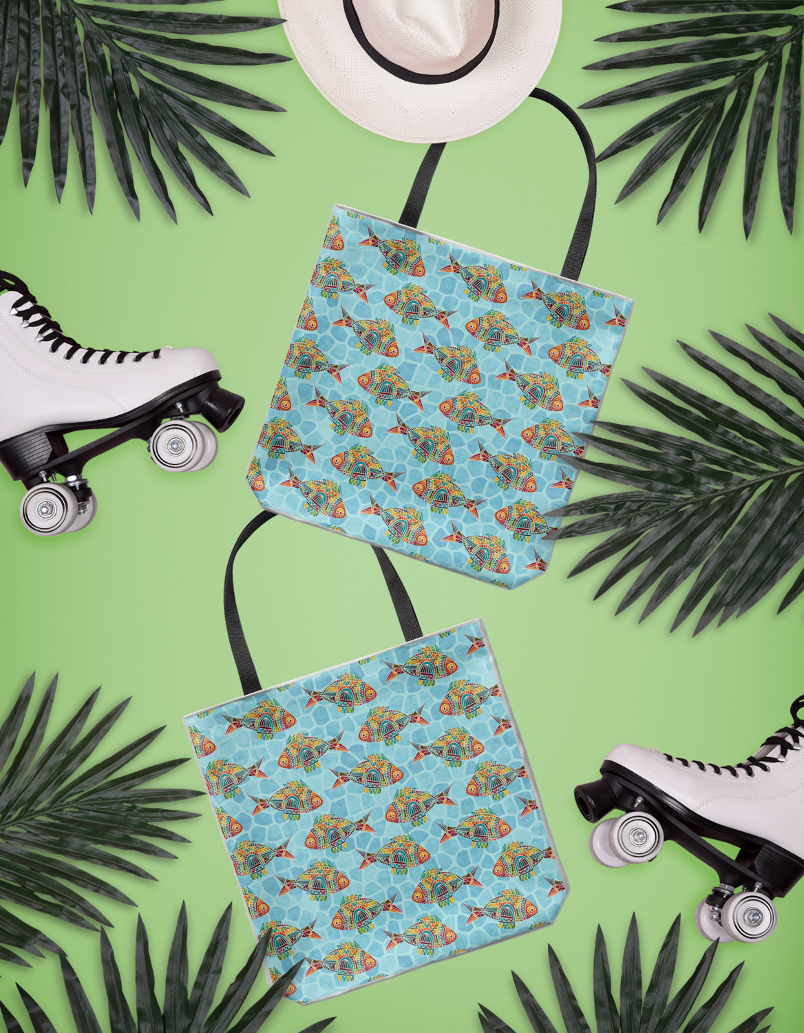 Our totes are made right here in the USA. Your design is printed on canvas fabric; the fabric is then cut and sewn on the sides and on the bottom to add an approximately 3.5 inch gusset. Black cotton handles are sewn in and reinforced. Your tote has a designs on both sides - the designs can be the same or different - the choice is yours. The inside of the tote has a black fused lining.