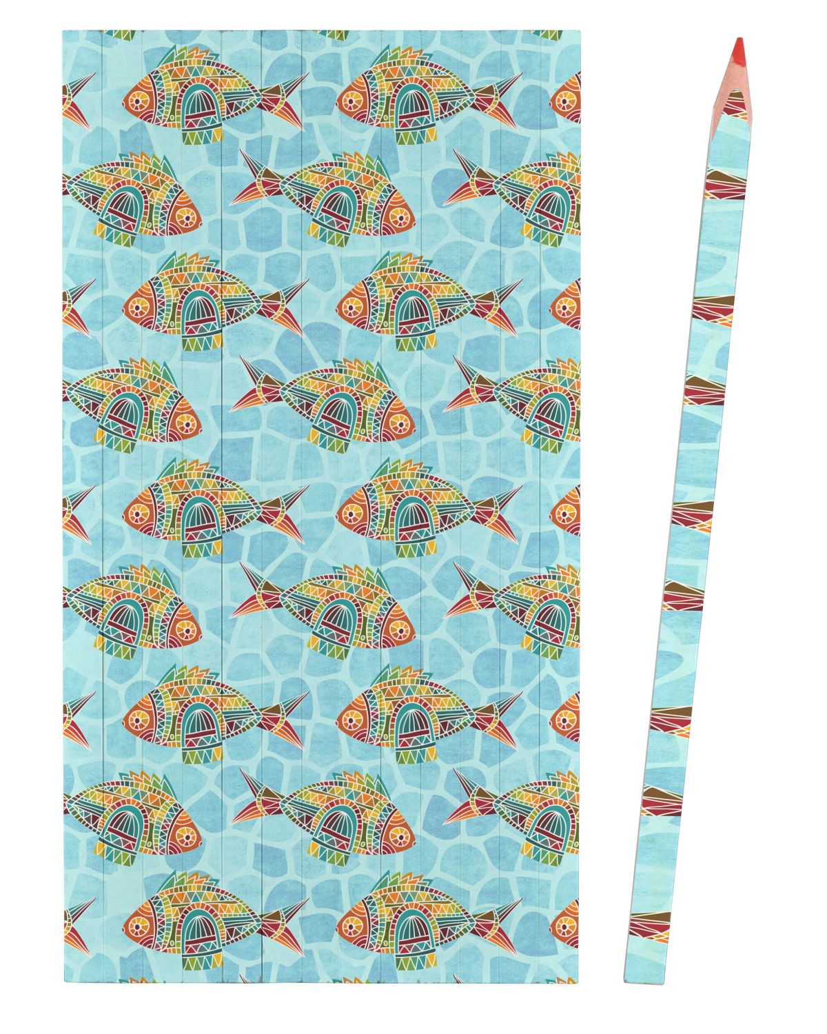 Looking for a fun, but still mature look for your beach house? This pattern with colorful mosaic fish with in a swimming pool tiles in the background is a great pattern to decorate with in a beach house or pool house or even just for pool bathroom . This pattern is also available with waves and a solid color background