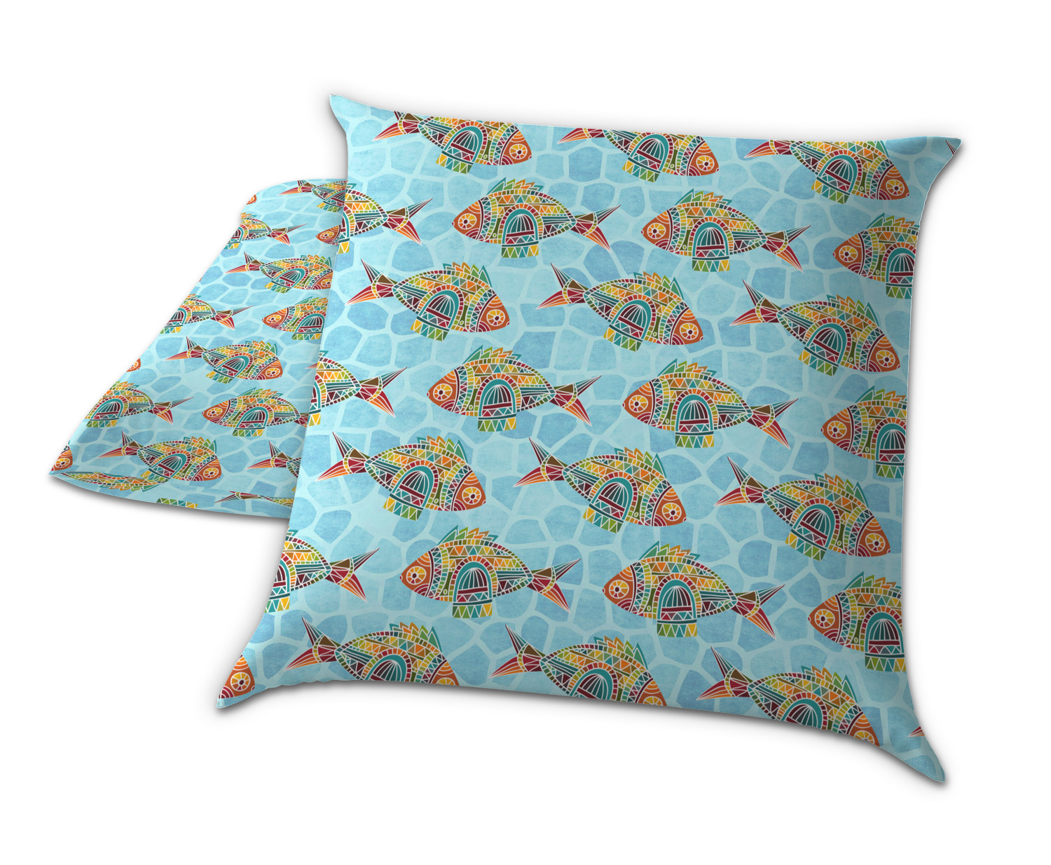 Looking for a fun, but still mature look for your beach house? This pattern with colorful mosaic fish with in a swimming pool tiles in the background is a great pattern to decorate with in a beach house or pool house or even just for pool bathroom . This pattern is also available with waves and a solid color background