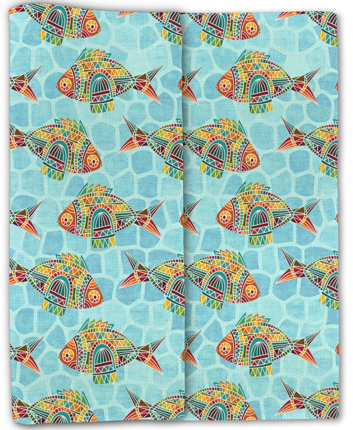 Looking for a fun, but still mature look for your beach house? This pattern with colorful mosaic fish with in a swimming pool tiles in the background is a great pattern to decorate with in a beach house or pool house or even just for pool bathroom . This pattern is also available with waves and a solid color background