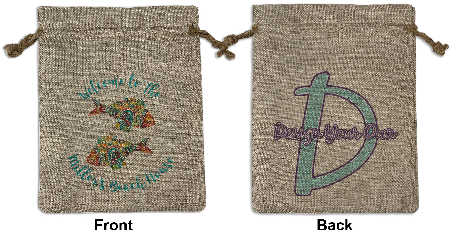 We sell our Burlap Gift Bags in 3 variant sized bags. Made with burlap polyester, each personalized bag can be secured with a twine drawstring pull. Your custom design is available to print on one side or both sides - completely up to you! The sizes of the bags measure approximately 4.5" x 6.5" for the smallest size, 6.5" x 8.0" for the medium size, and 6.5" x 13.5" for the large-sized bag.