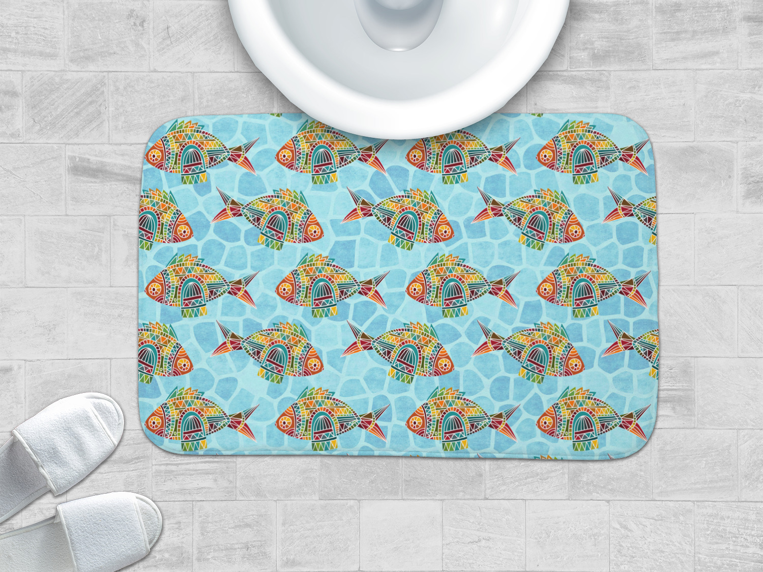 Looking for a fun, but still mature look for your beach house? This pattern with colorful mosaic fish with in a swimming pool tiles in the background is a great pattern to decorate with in a beach house or pool house or even just for pool bathroom . This pattern is also available with waves and a solid color background
