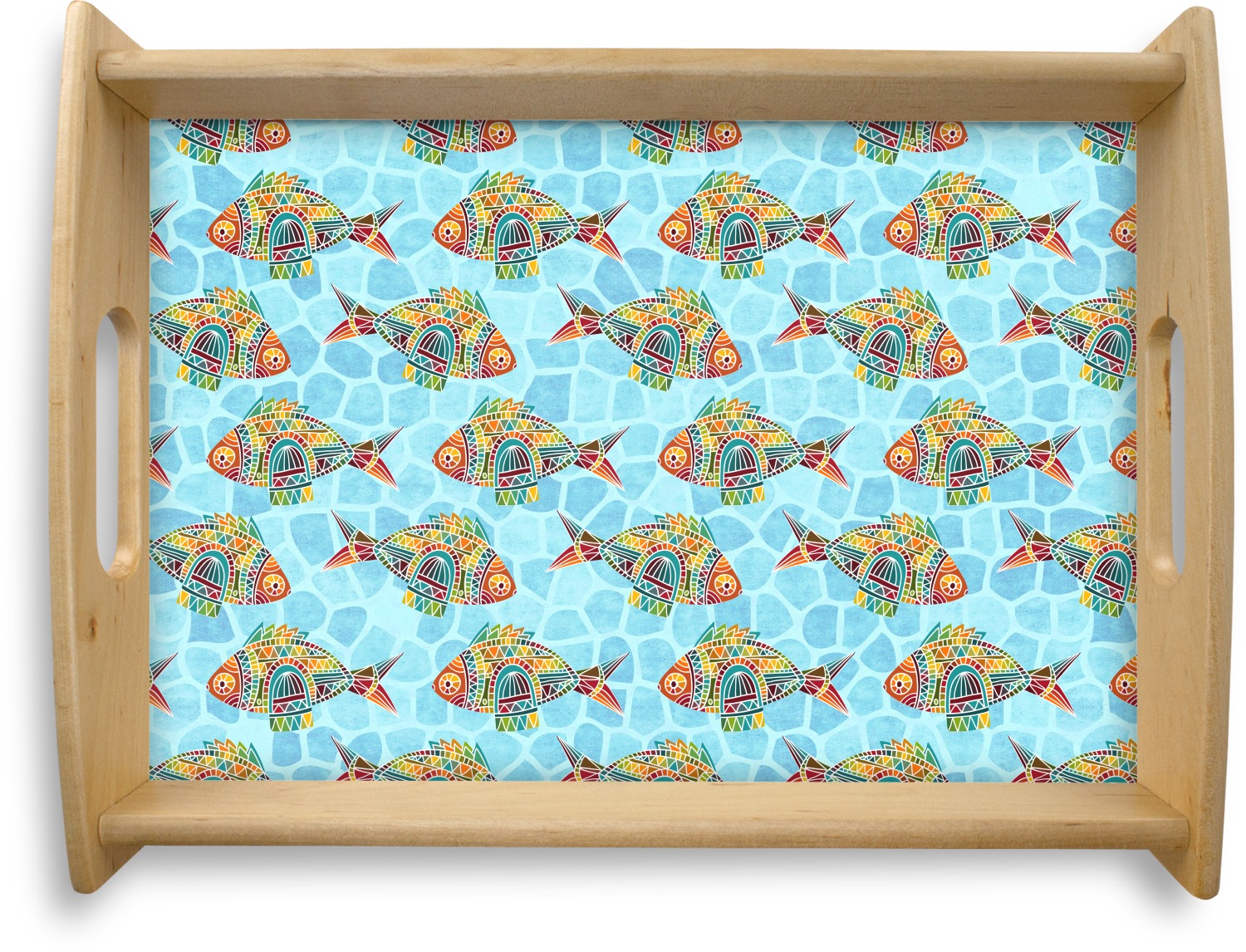 This serving tray with handles features square edges and two rounded sides, creating a very modern look. Each side is fabricated from a beautifully cut, natural wood. The bottom of the interior of the tray displays your customized design in bright, vibrant color. The tray is sold in both a black color and a natural wood look. Each variation of the wood serving tray has two sizes: Small, which is 14" x 10" x 2.25", and Large, which is 19.5" x 13.5" x 2.75".