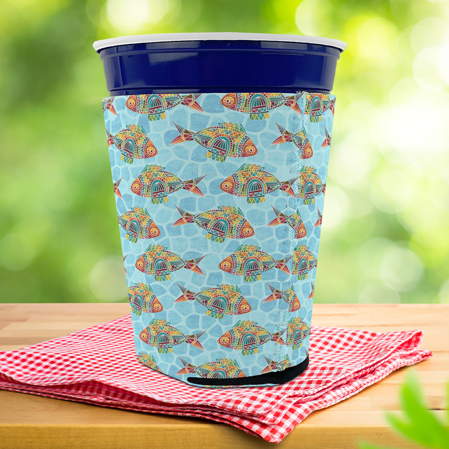 Made from neoprene with a polyester outer fabric and sewn seams, these premium quality party cup sleeves are very durable and will hold up to heavy use. They are available in 2 styles - with a bottom or just a sleeve to go around the outside of the tapered cup. The sleeve covers are about 4" tall and cover about 90% of the classic 16 oz. Solo cup.