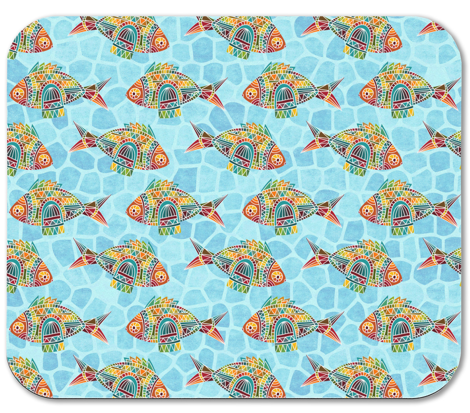 Looking for a fun, but still mature look for your beach house? This pattern with colorful mosaic fish with in a swimming pool tiles in the background is a great pattern to decorate with in a beach house or pool house or even just for pool bathroom . This pattern is also available with waves and a solid color background