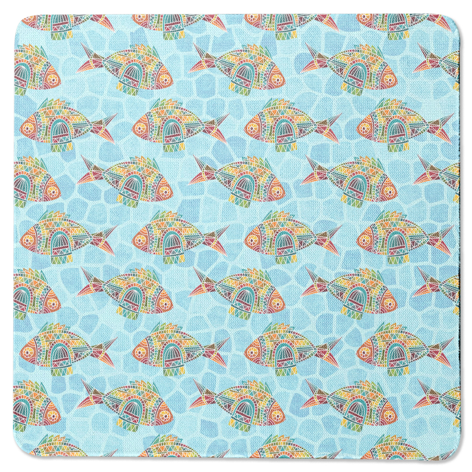 Looking for a fun, but still mature look for your beach house? This pattern with colorful mosaic fish with in a swimming pool tiles in the background is a great pattern to decorate with in a beach house or pool house or even just for pool bathroom . This pattern is also available with waves and a solid color background