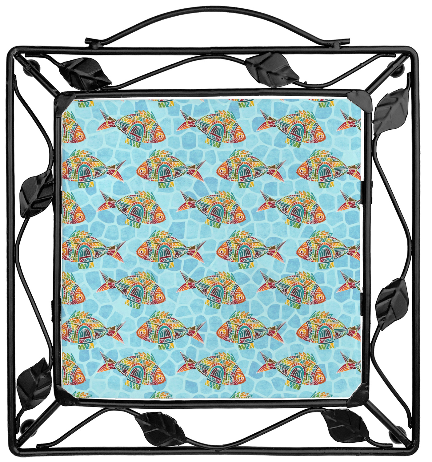 Our square trivets are made from a durable, wrought iron. This model features 4 small half circles, one on each corner, and a larger ring of iron that circles the central, customized tile. Each of the 4 corners has a round foot on its bottom for stability. This trivet is 8.75 by 8.75 inches, but the central tile measures at 6 inches on both sides.