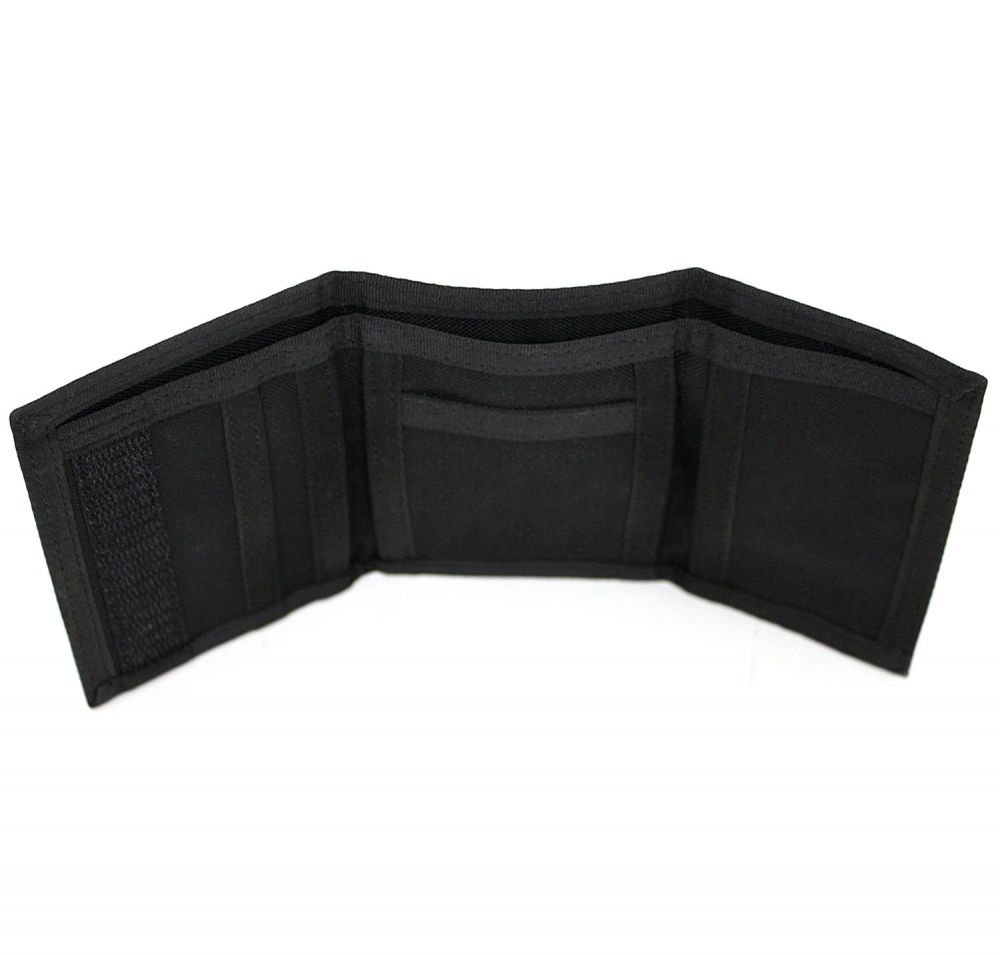 The wallets are black with the design printed on the front flap. You are able to create your design either horizontally OR vertically. They have 4 slots for IDs or credit cards and 1 large slot for cash. The wallet folds in thirds and is tightly secured by velcro. They are great starter wallets for kids or just as a good durable wallet for an adult.