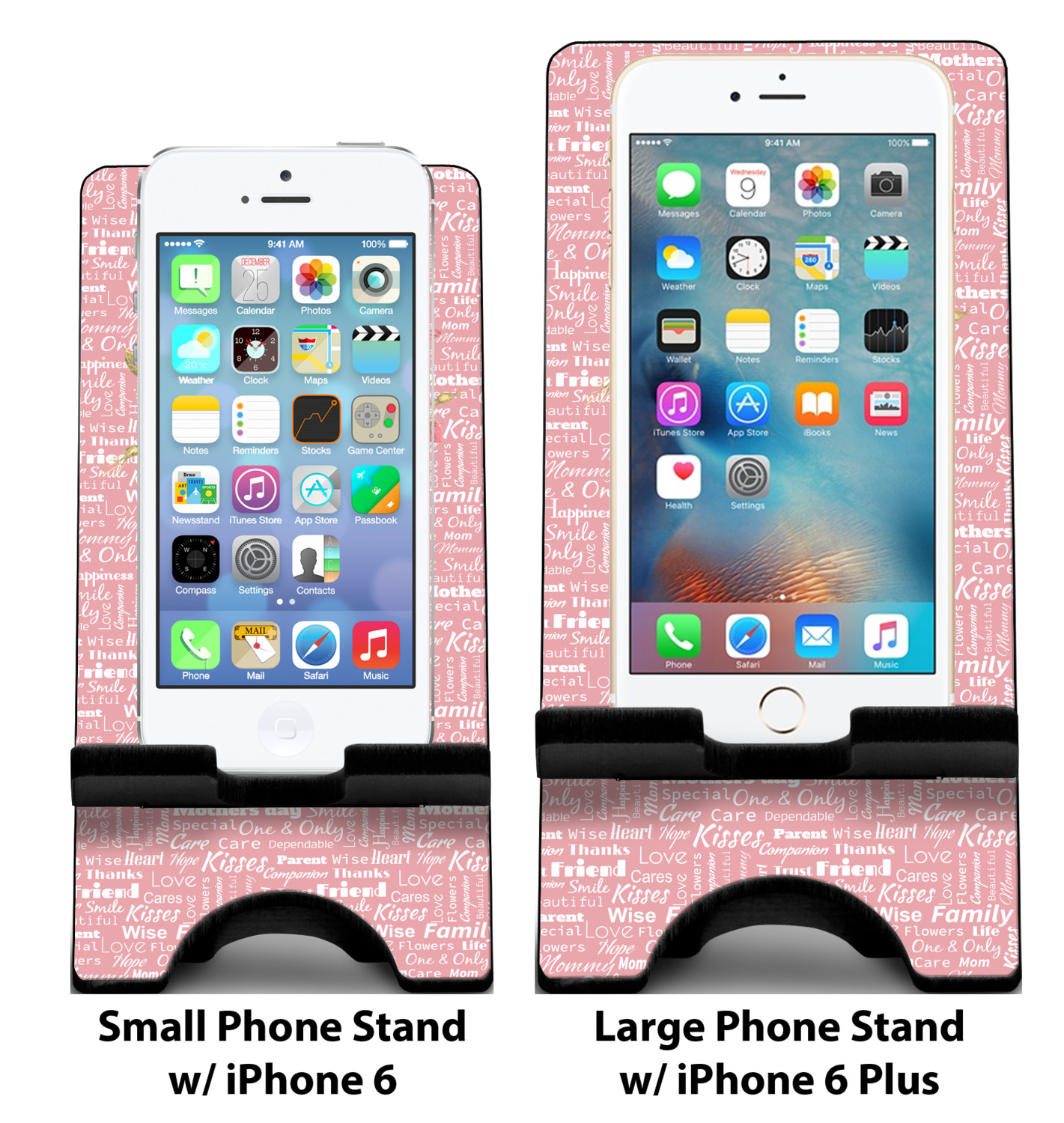 To meet your needs, we offer four variations of this IPhone stand. The backboard of the first version is shaped as a plain, yet sleek rectangle, and is available in two sizes. Our smaller size is approximately 4 by 3.25 by 7 inches, while the larger model is 4 by 3.77 by 8.5 inches. Alongside this model, we also provide you with a more decorative option. The upper part of our second version features a curved edge, for a classy, suave appearance. This phone holder is also sold in two sizes: a smaller version, which is 4 by 3.25 by 7 inches, and our larger model, which is 4 by 3.77 by 8.5 inches. Both models will support large phones, but the larger model is better if you wish to proudly display your personalized design.