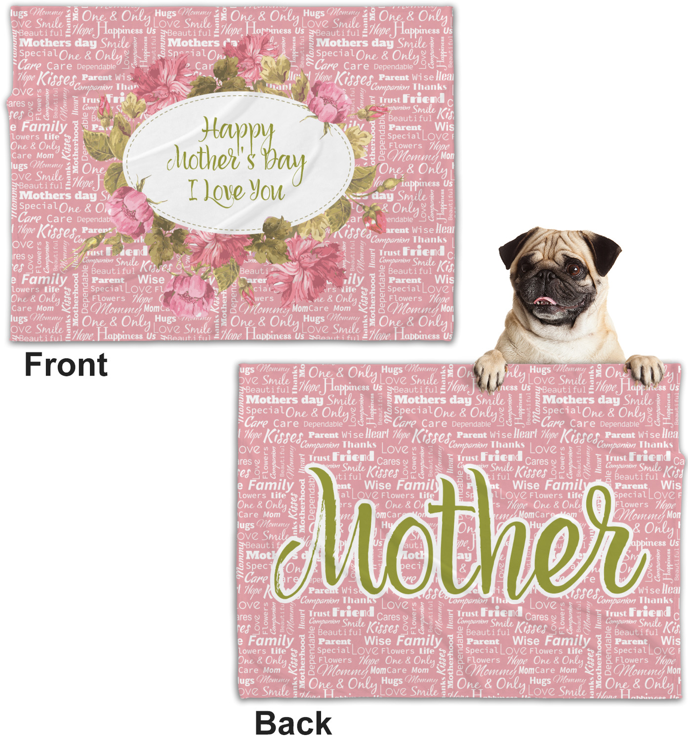These dog blankets are crafted from a gentle, soft-to-the-touch, minky material. We print your customizations, either matching or differing, on both the top and underside of the blanket. These personalized dog blankets are available in two sizes: regular and large. Our regular size, at 40" x 30", accommodates small and some medium size dogs. At 60" x 50", our large dog blanket is a better fit for bigger breeds. Though specialized for dogs, these blankets still make a thoughtful gift for your favorite feline, or any other pet in mind!