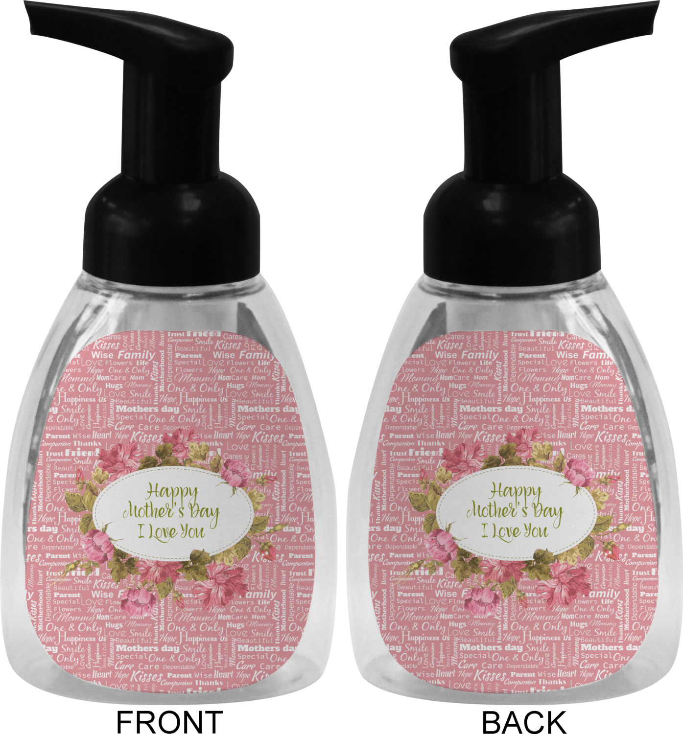 This soap dispenser is made of a robust plastic and has a clear base. The included soap pump is available in black or white color. This dispenser is 6.5 inches tall, 3 inches wide, and 2 inches deep. We display your customized designs on the front and back sides of these foaming hand soap dispensers.
