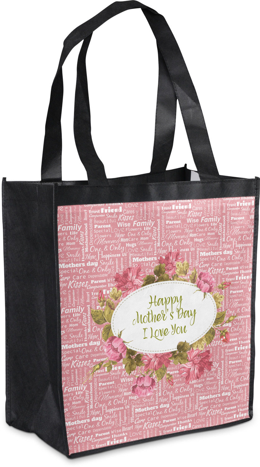 Made from a durable, biodegradable material, these reusable shopping bags can support up to 30 pounds of weight. With two large handles, measuring at 8.5 inches each, these personalized tote bags are easy to carry to your vehicle or home. The bag itself is 12 by 13.5 inches, and can expand to a depth of 7 inches. Your customization is printed on both the front and back, while the remaining sides, trim, and handle are a sleek, charcoal black.