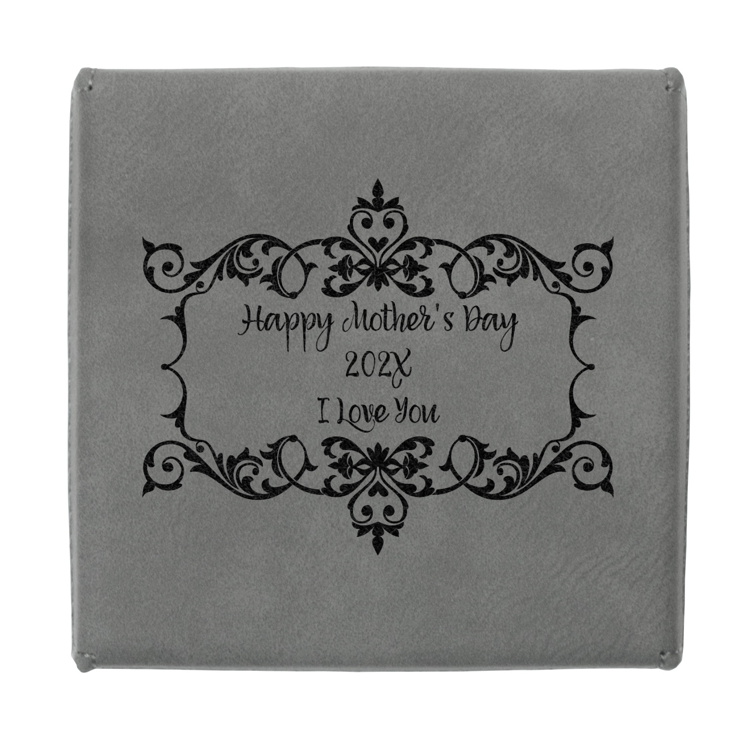 This jewelry gift box measures 3.5 inches long by 3.5 inches wide, and 1 inch deep. The box fits different sized jewelry items such as bracelets, necklaces, watches, earrings, rings and more. Engraved with a laser this high quality paper board and faux leather jewelry gift box is unique and makes any gift stand out.