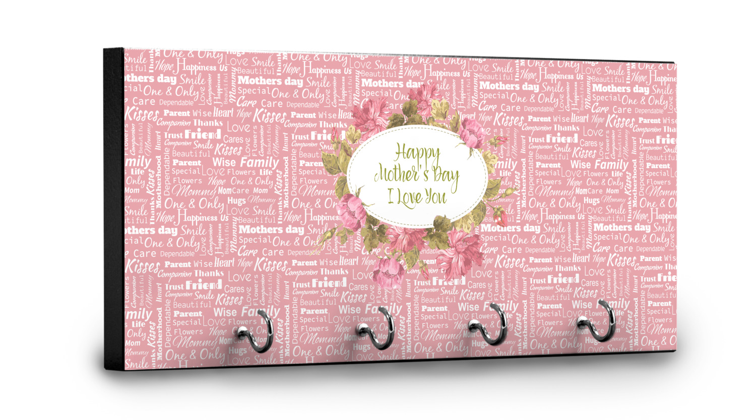 This 11" x 5" key hanger is made of sturdy wood and has four metal hooks lining the bottom. This is the perfect size for a family with several drivers. Not only can you hang keys on it though, but pet leashes and other small items. The board is black on the sides and back and is printed with the design of your choice on the front.