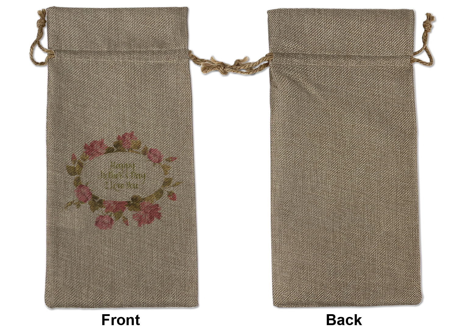 We sell our Burlap Gift Bags in 3 variant sized bags. Made with burlap polyester, each personalized bag can be secured with a twine drawstring pull. Your custom design is available to print on one side or both sides - completely up to you! The sizes of the bags measure approximately 4.5" x 6.5" for the smallest size, 6.5" x 8.0" for the medium size, and 6.5" x 13.5" for the large-sized bag.