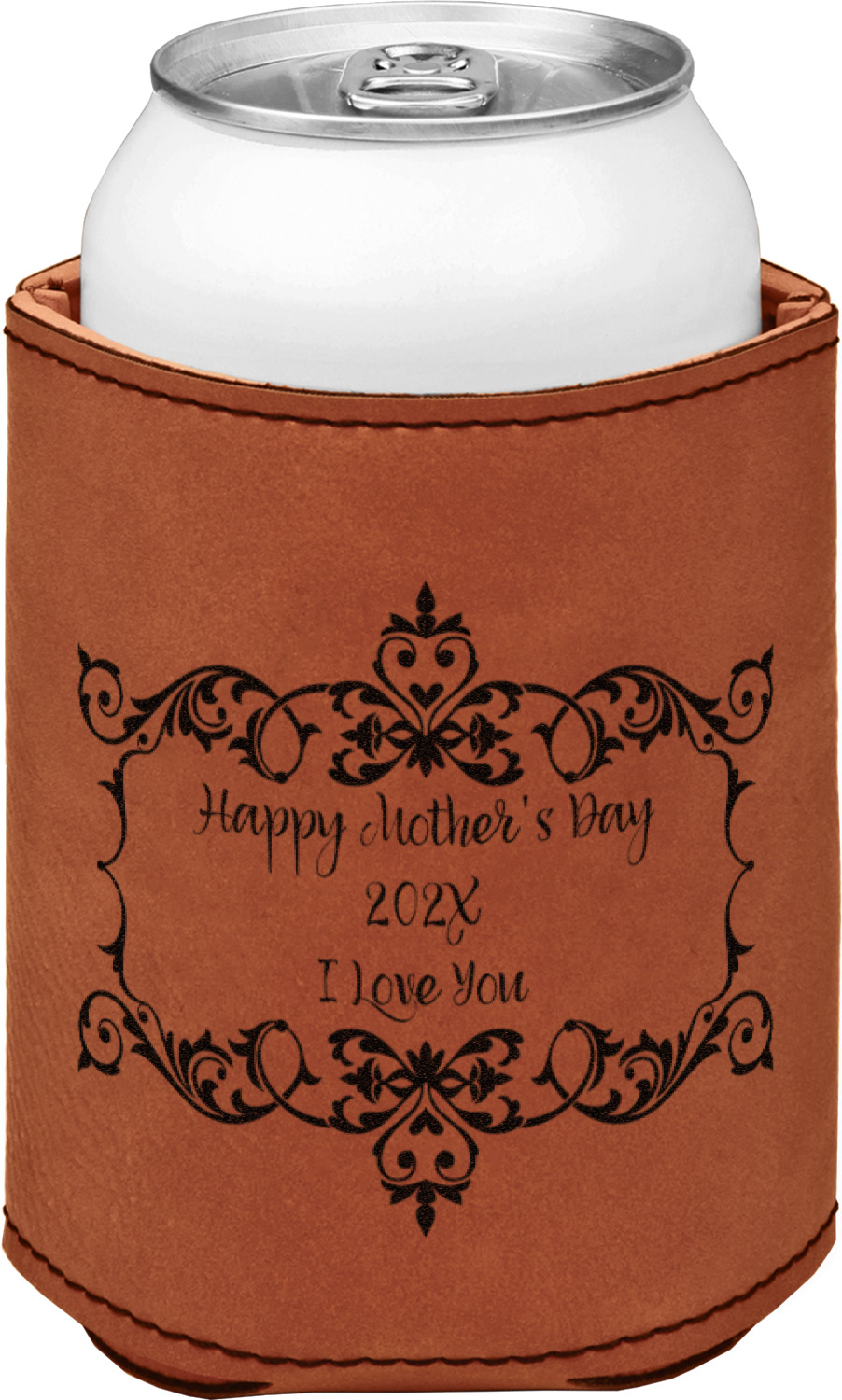 This can sleeve is made from a cognac-brown leatherette and stitched with a sturdy, black thread. A slim padding lines the inside of your can sleeve to allow for a better fit once your drink is inserted. The sleeve itself measures at 4 by 4.5 inches, allowing this custom can sleeve to accommodate most canned drinks. Your personalized design can be engraved on the front and back, or solely the front. When laser-engraved, your design appears as a black coloration which contrasts the leatherette nicely.