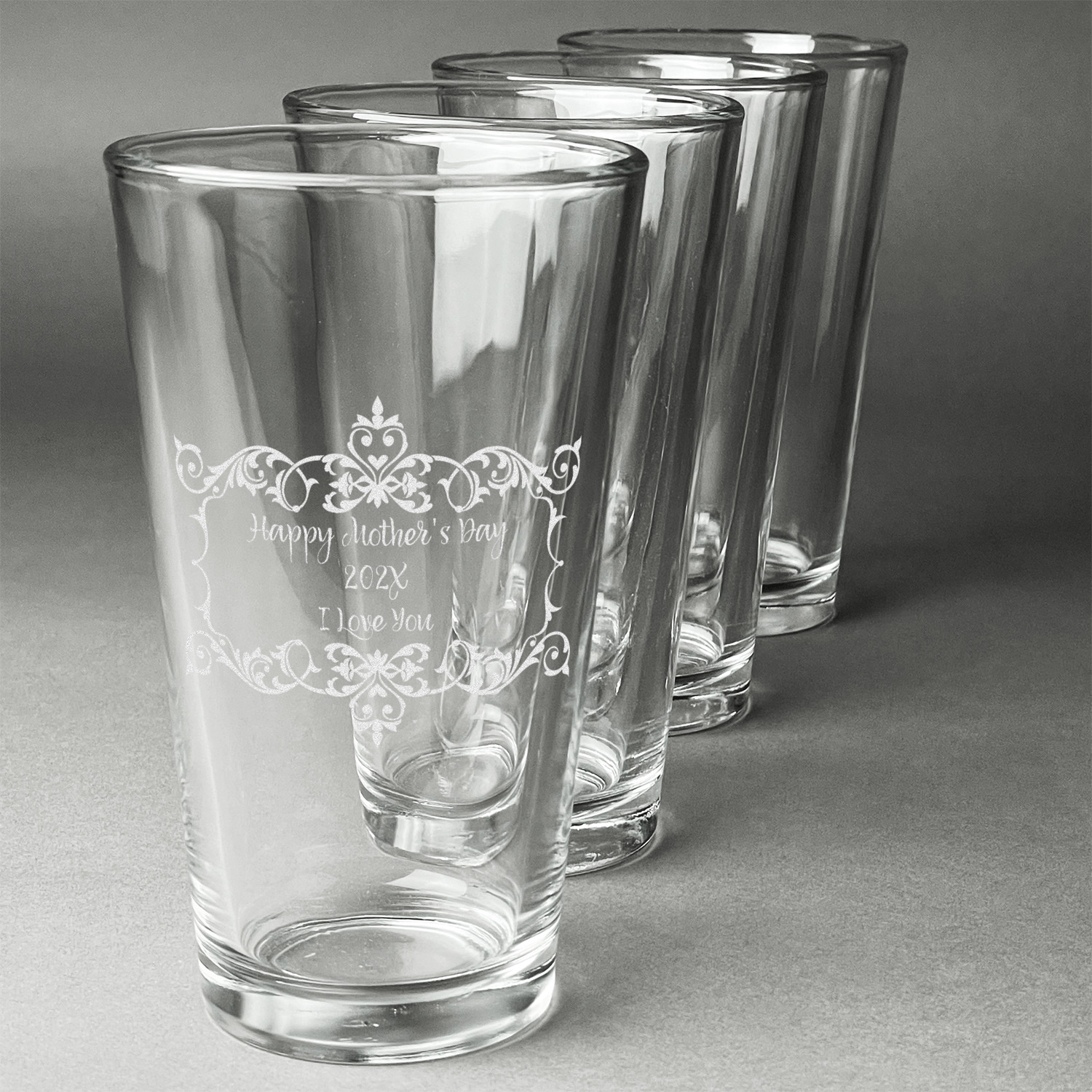 Available in a single glass or a set of 4 - each glass will be custom engraved with your design. Each glass holds 16 oz and measure 5.75"H x 3.5"W.