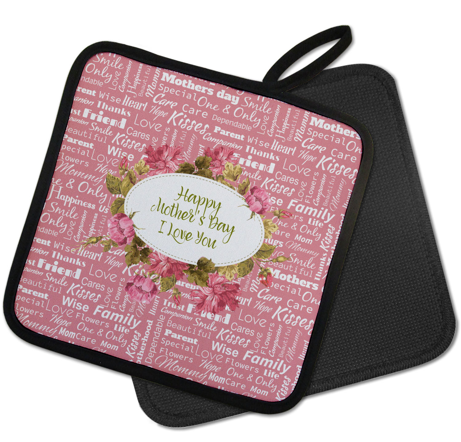 Our personalized pot holders feature a neoprene front that displays your personalization in vibrant colors. The backing of the hot pot holder is rubberized; the textured backing allows you to have a great grip when using this custom pot holder. The two materials are joined with a sleek, black trim, and the holder also includes an attached loop for hanging and storage. The pot holder is approximately 8.75 inches by 8.75 inches and 0.25 inches tall, while the fabric loop is 2.5 inches long. You can purchase a kitchen pot holder by itself or as a set of 2. We also offer a set including one pot holder and one oven mitt.