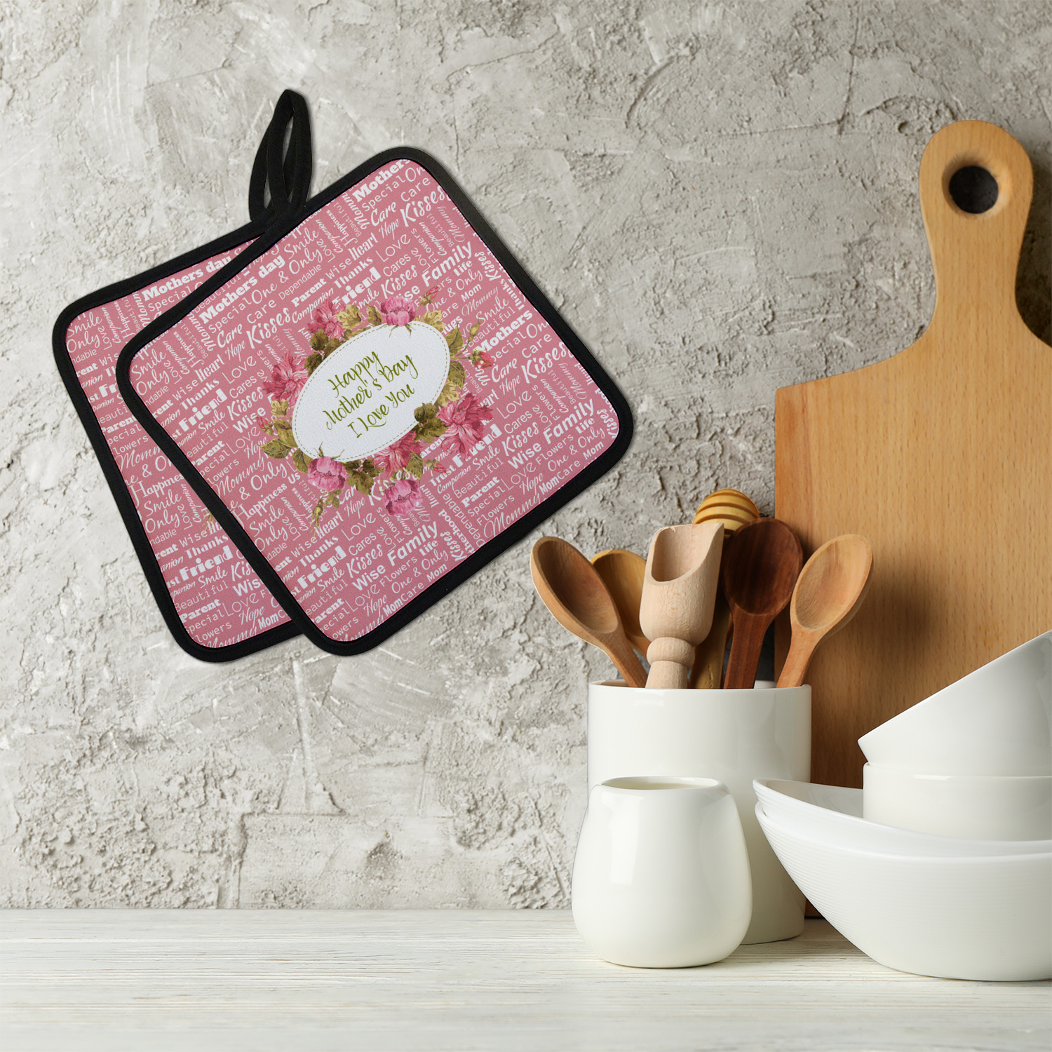 Our personalized pot holders feature a neoprene front that displays your personalization in vibrant colors. The backing of the hot pot holder is rubberized; the textured backing allows you to have a great grip when using this custom pot holder. The two materials are joined with a sleek, black trim, and the holder also includes an attached loop for hanging and storage. The pot holder is approximately 8.75 inches by 8.75 inches and 0.25 inches tall, while the fabric loop is 2.5 inches long. You can purchase a kitchen pot holder by itself or as a set of 2. We also offer a set including one pot holder and one oven mitt.