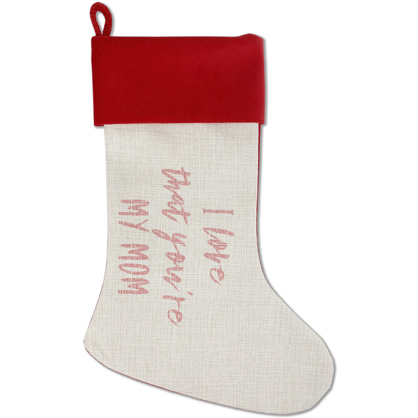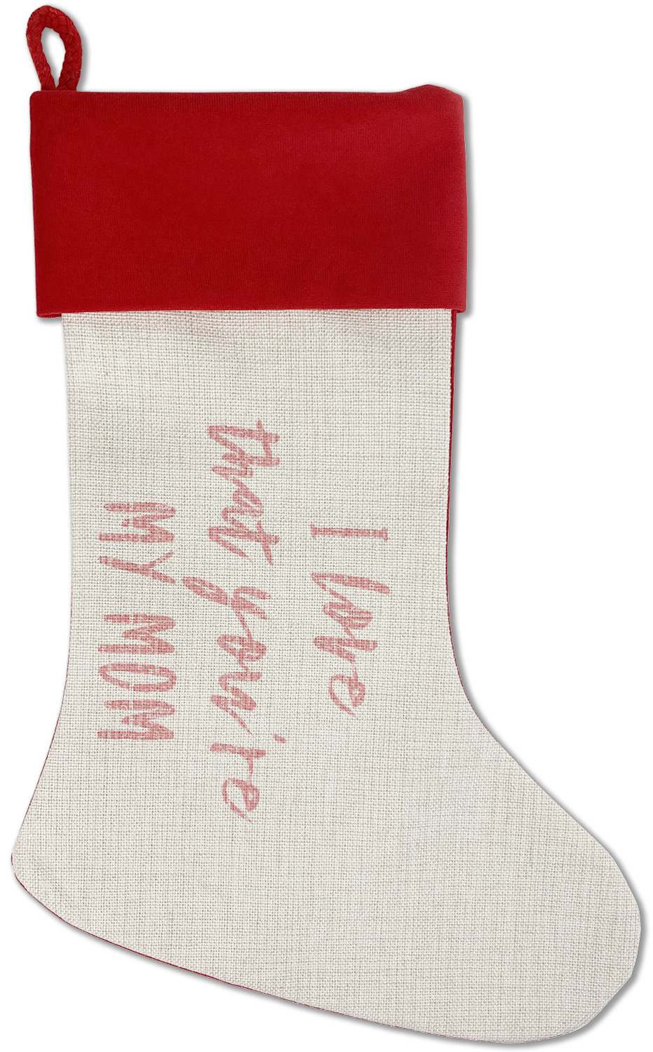Our classic red stockings are made from a soft, yet durable polyester material perfect for any stocking stuffer! The front of our Christmas stockings have a linen front that boldly displays your custom design accented with a lush red cuff resting all around the stocking. Each stocking is approximately 18x12 with a durable cotton rope loop for hanging.
