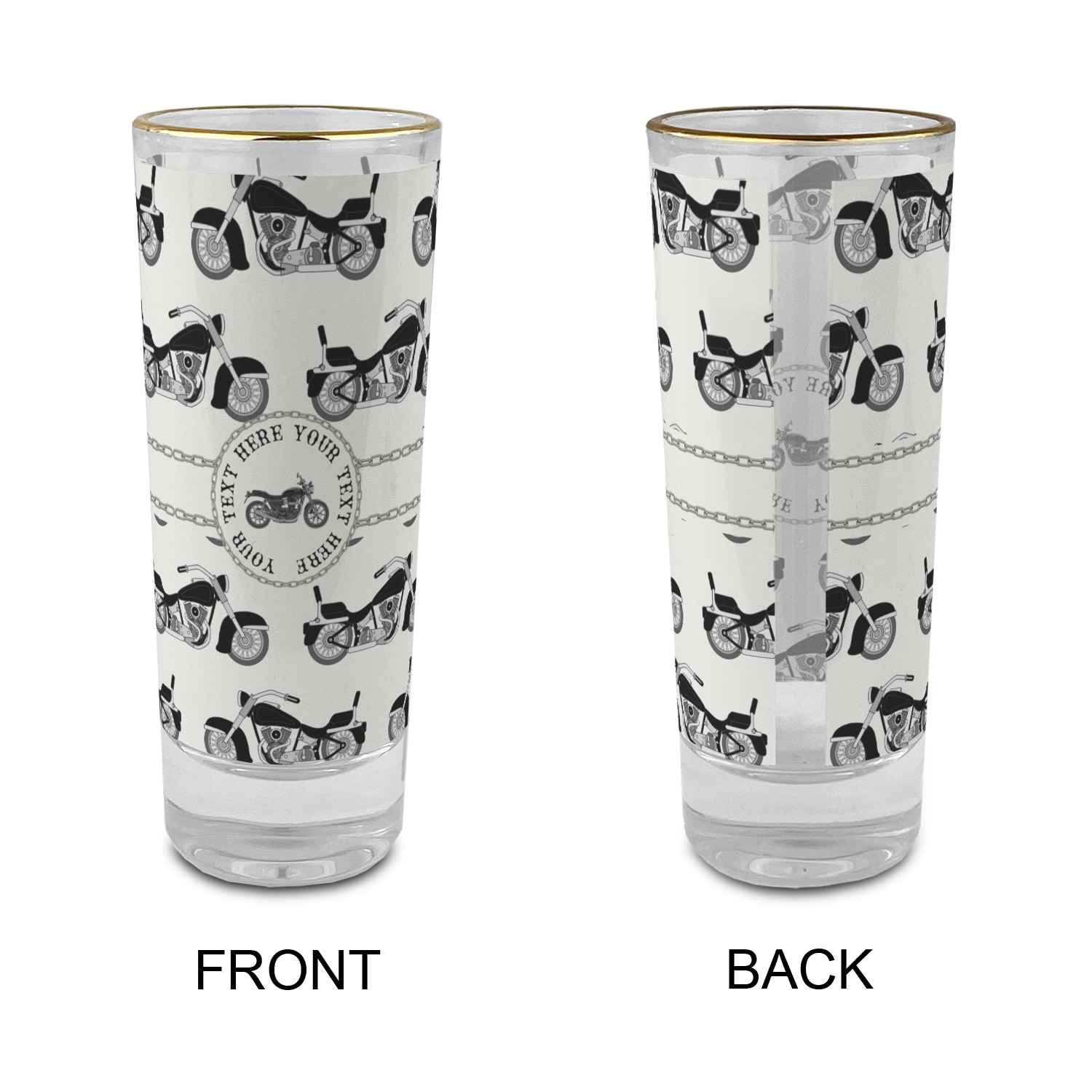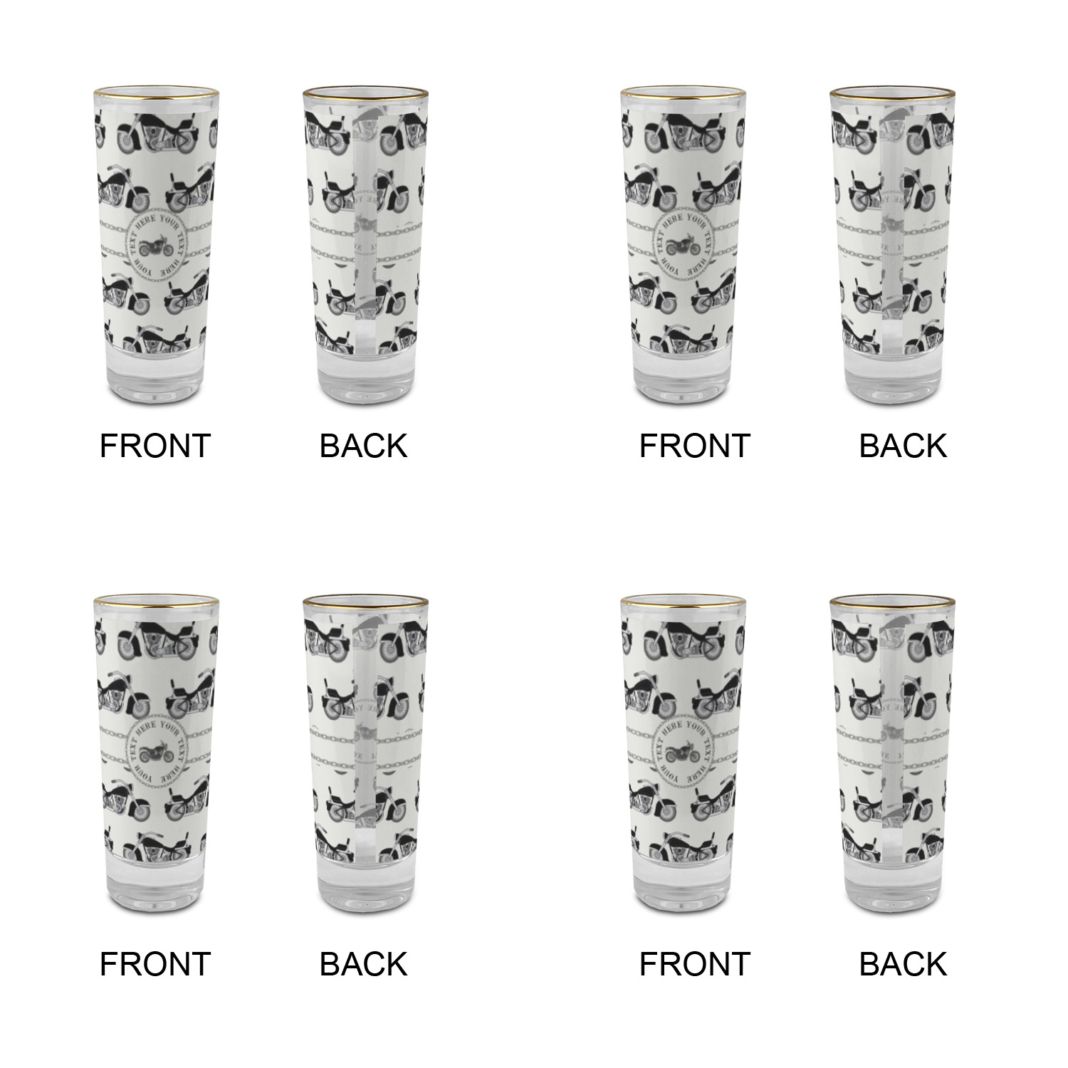 These glass shooter glasses are printed in full color with the design of your choice. These are a tall shooter 2 oz size and stand 4" tall. The print is a full wrap design to boldly display your personalization.