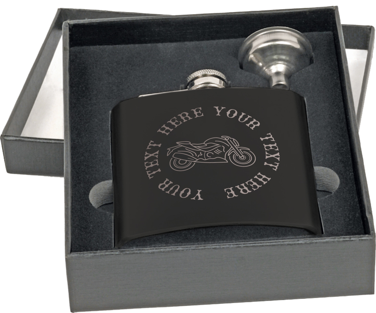 Built from a stainless steel and then covered with a black coating, this hip flask, has a very classy appearance. Similar to the standard flask, this stainless steel flask has the traditional curved shape for a snug fit in your palm. This flask set also includes a traditional screw and flip lid and liquid funnel in a gift box. At 4 by 4.5 inches, this flask can hold up to 6 ounces. Your personalized design is laser-engraved across the front of this flask.
