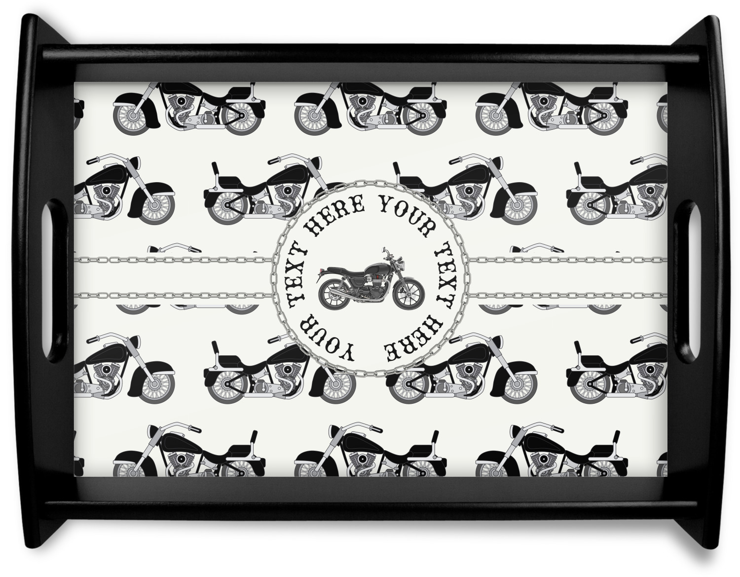 This serving tray with handles features square edges and two rounded sides, creating a very modern look. Each side is fabricated from a beautifully cut, natural wood. The bottom of the interior of the tray displays your customized design in bright, vibrant color. The tray is sold in both a black color and a natural wood look. Each variation of the wood serving tray has two sizes: Small, which is 14" x 10" x 2.25", and Large, which is 19.5" x 13.5" x 2.75".
