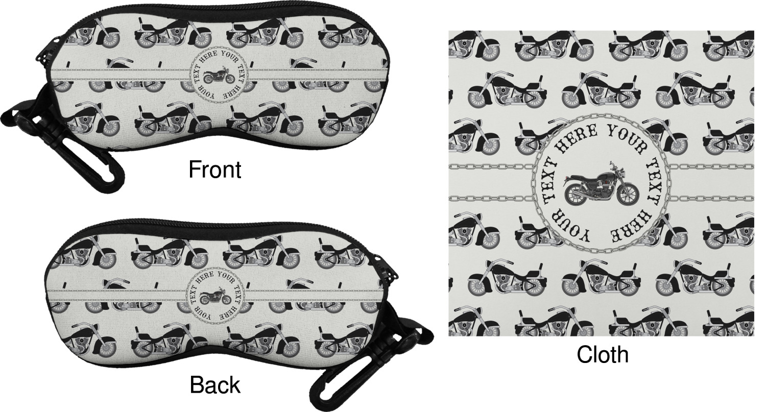 The cases have the design on both sides, a black zipper, and clips for hanging on a belt buckle or purse strap and also include matching lens cloths.